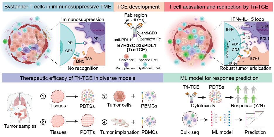 Rather than trying to amplify tumour-specific T cells—which are scarce in cold tumours—we aimed to redirect existing bystander T cells toward tumour cells while simultaneously relieving local immunosuppression. This led us to develop a trispecific T-cell engager targeting B7-H3, CD3 and PD-L1. Crucially, the innovation was not only in target selection, but also in antibody architecture. Using a modular and affinity-tuned design, we engineered a “dynamically accessible” multispecific format. High-affinity bivalent binding anchors the antibody to B7-H3 on tumour cells; the CD3-binding module is structurally recessed, becoming accessible only in close proximity to tumour cells to avoid off-target T-cell activation; and the PD-L1-binding module is deliberately designed with lower affinity to maintain controllable interactions within the tumour microenvironment. Across tumour cell–PBMC co-cultures, patient-derived tumour suspensions and intact tumour sections, this strategy consistently unleashed potent T-cell cytotoxicity. In multiple humanized mouse models, we observed profound tumour regression and, in some cases, complete tumour clearance—even in tumours with extremely low baseline T-cell infiltration.