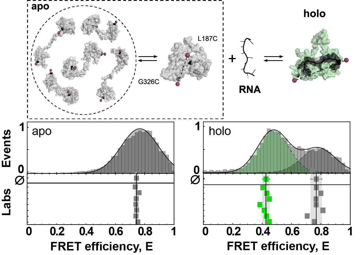 Having solved these issues, we obtained good agreement of the reported FRET efficiency histograms for the dynamic U2AF2. However, we still observed larger variations compared to MalE, especially in the RNA-bound state (see Figure 2c), likely caused by temperature differences in the participating labs (affecting the dynamic equilibrium) or degradation of the RNA ligand. The highly dynamic RNA-free state seemed like an ideal system to test whether the high reproducibility of FRET efficiency histograms would also translate to the detection and quantification of conformational dynamics. Indeed, using two commonly applied methods for detection of dynamics we could show an excellent agreement even in terms of the timescales of the structural fluctuations (see Figure 4 and Figure 5e). Finally, there is more to be said about the complex dynamics of U2AF2 and how smFRET experiments can help understand them with state-of-the-art analysis methods. In the end, this analysis was condensed into Figure 6, but let it be noted that it took a large effort of first and corresponding authors alike to understand the U2AF2 system in detail.