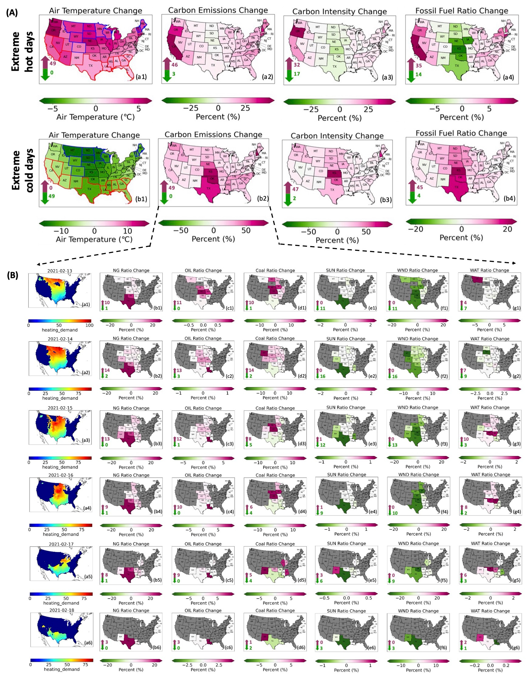 2) In general, extreme events increase carbon emissions and reliance on fossil fuel across the U.S. states. Specifically, extreme cold events will increase 23.4% carbon emissions on the basis of the normal Ta periods and reliance on the share of fossil fuels by increasing 14.7% in 48 U.S. states on average. Similarly, the extreme hot events will increase 14.1% carbon emissions in 46 states and 6.7% fossil fuels usage in 37 states on average, on the basis of normal Ta periods. In addition, the wind power reductions during extreme cold days and increase during extreme hot days over the central U.S. are also clearly seen. Although the issue of frozen wind turbines has been studies many years, the wind power seems still affected more during extreme cold days than extreme hot days.