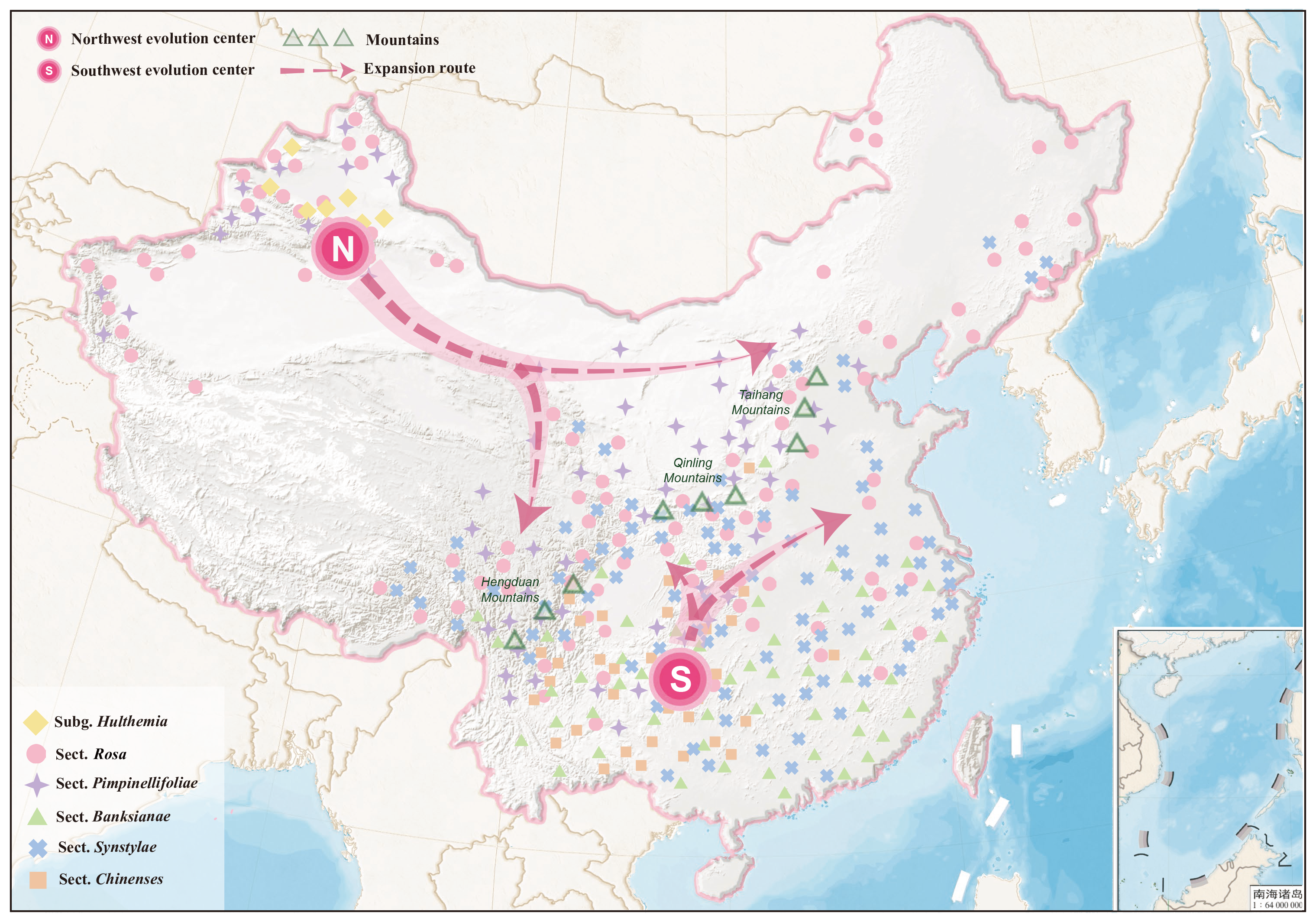 Our findings also indicated that wild Rosa species in China originated from two distinct diversity centers: one in the northwest and another in the southwest. The Qinling Mountains served as a corridor for genetic exchange between these centers of diversities. Ancestral trait analyses suggested that early Rosa species had single-petaled yellow flowers, which later diversified into pink, red, and multi-petaled forms through both natural and artificial selections.