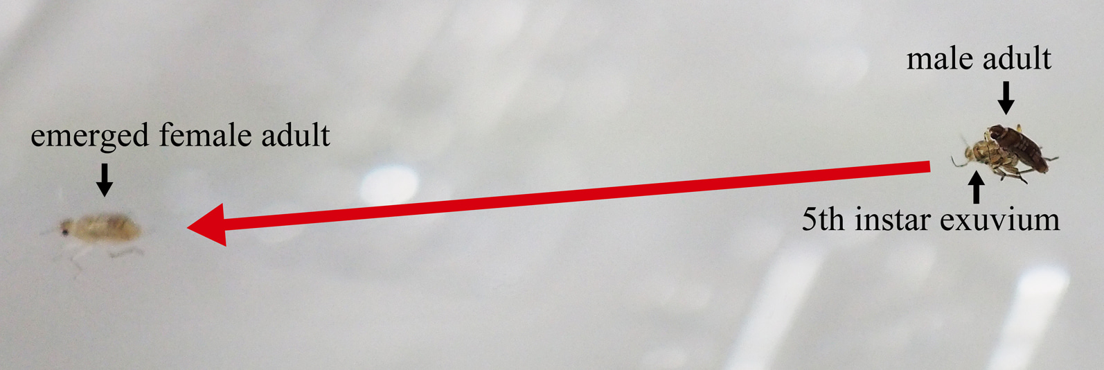 To examine whether males mounted female nymphs in the absence of adult females, we conducted the following experiment: one mature virgin male and one fifth-instar female nymph were placed in a rearing cup; 79.6% of males mounted the female nymphs within 5 h, and all males were observed to chase the female nymphs, including those they did not mount. When female nymphs emerged, the males transferred to the emerged female and mated.