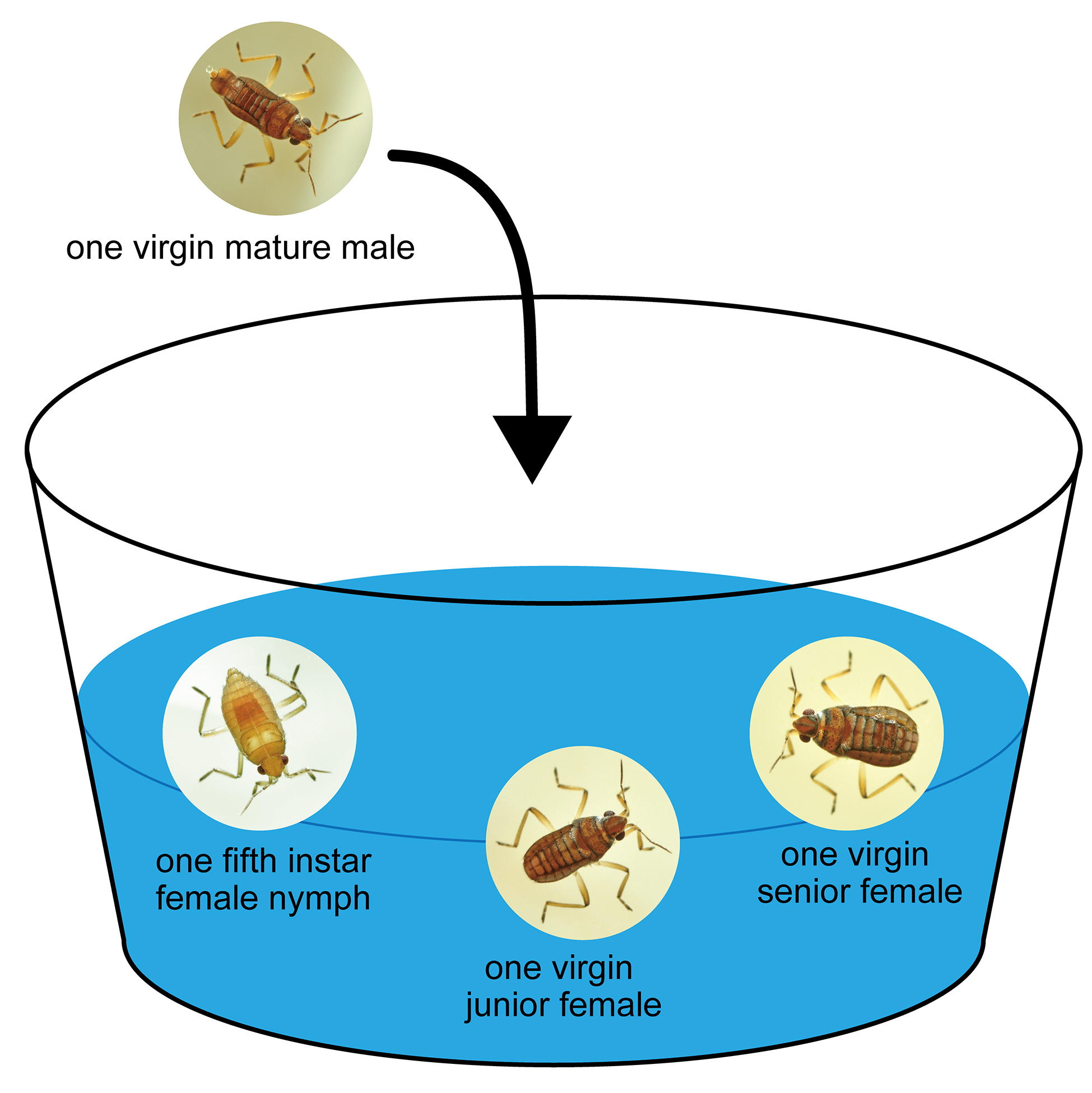 To determine which life-stage females the males preferred as their mating partners, females at three life stages–one virgin female more than three days after emergence (hereinafter referred to as a senior female), one virgin female within 24 h of emergence (hereinafter referred to as a junior female), and one fifth-instar female nymph–were placed in a clear plastic cup.