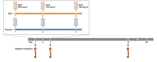 In the study presented here, we aimed to identify biomarkers associated with clinical outcomes for patients with COVID-19 and the impact of RDV treatment on these biomarkers over time. The patients included in the study had tested positive for SARS-CoV-2 and were considered at risk for severe disease because of their age (≥60 years) or the presence of other risk factors, such as chronic lung, kidney, liver, or heart disease; hypertension; diabetes; obesity; immunocompromised; cancer; or sickle cell disease. Patients enrolled in the study had a baseline blood sample taken and were then given RDV or placebo (Fig. 1). Additional blood samples were taken on days 3 and 14 after treatment to assess how blood, inflammation, and coagulation biomarkers were impacted by RDV.