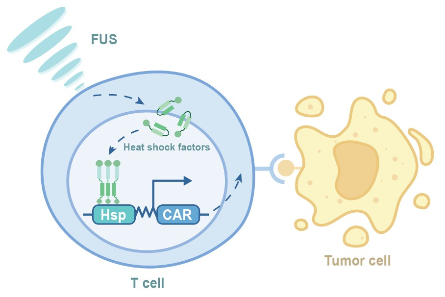 Focused ultrasound (FUS) has been in the clinics for a long time, partly attributed to the deep penetration capability of FUS for tens of centimeters. Owing to its ability to generate local hyperthermia in biological tissues, it was primarily used for tumor ablation. Other applications of FUS include drug delivery, neuromodulation, vasodilation, etc. At less lethal temperatures, FUS has also been used to activate heat-sensitive genes in cells. Inspired by this, we set off to develop FUS-controllable CAR (FUS-CAR) T cells by equipping T cells with heat-inducible genetic circuits.