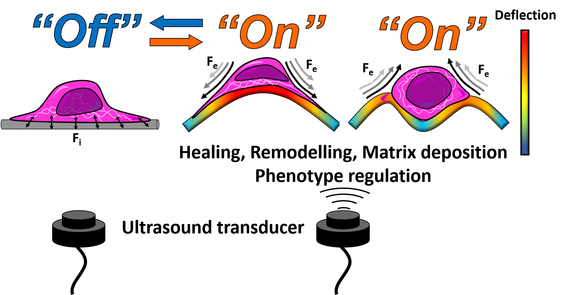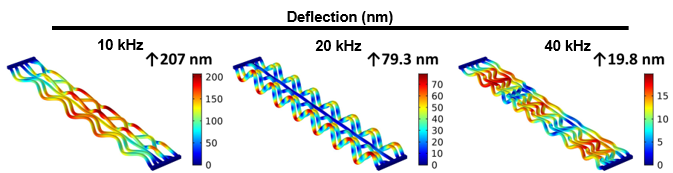 But, how to render a 3D printed scaffold dynamic? This was perhaps the key question to be answered here. While material scientist can play many tricks to create shape-memory or shape-morphing materials, finding a stimulus that could remotely activate a mechanical signal on a robust scaffolds and compatible with physiological environments seemed challenging at first. However, the answer was already out there. Ultrasounds have been used for over decades on clinical environments to, for example, warm up the tissue been treated by a physiotherapist. Ultrasounds, as pressure waves, produce a vibration while crossing different environments. We modelled the vibration (or nanodeflection) that an ultrasounds wave would generate on our 3D printed scaffolds and realised that could easily control the amplitude of the deflections with the applied ultrasound frequency.