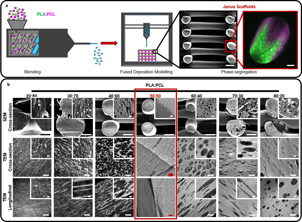 The idea behind this approach came up by accident, as many scientific discoveries, just that in this case was a long-term one. When I joined forces at the MERLN institute, Prof. Moroni suggested to apply the physicochemical concepts that we demonstrated earlier in electrospun scaffolds to 3D printed robust structures. The concept here was to create self-assembled or phase-segregated structures during the printing process, allowing thus the control of not only the structure of the fabricated structure but also the spatial chemical distribution of the building materials.