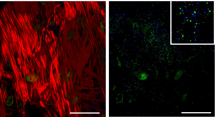 Figure 4| Dynamic culture activates voltage-gated calcium ion channels. Human bone marrow-derived stem cells (right, F-actin in red) cultured under daily ultrasound stimulation present activated voltage-gated calcium ion channels (right, DHPR channels in blue and RyR receptor in green)