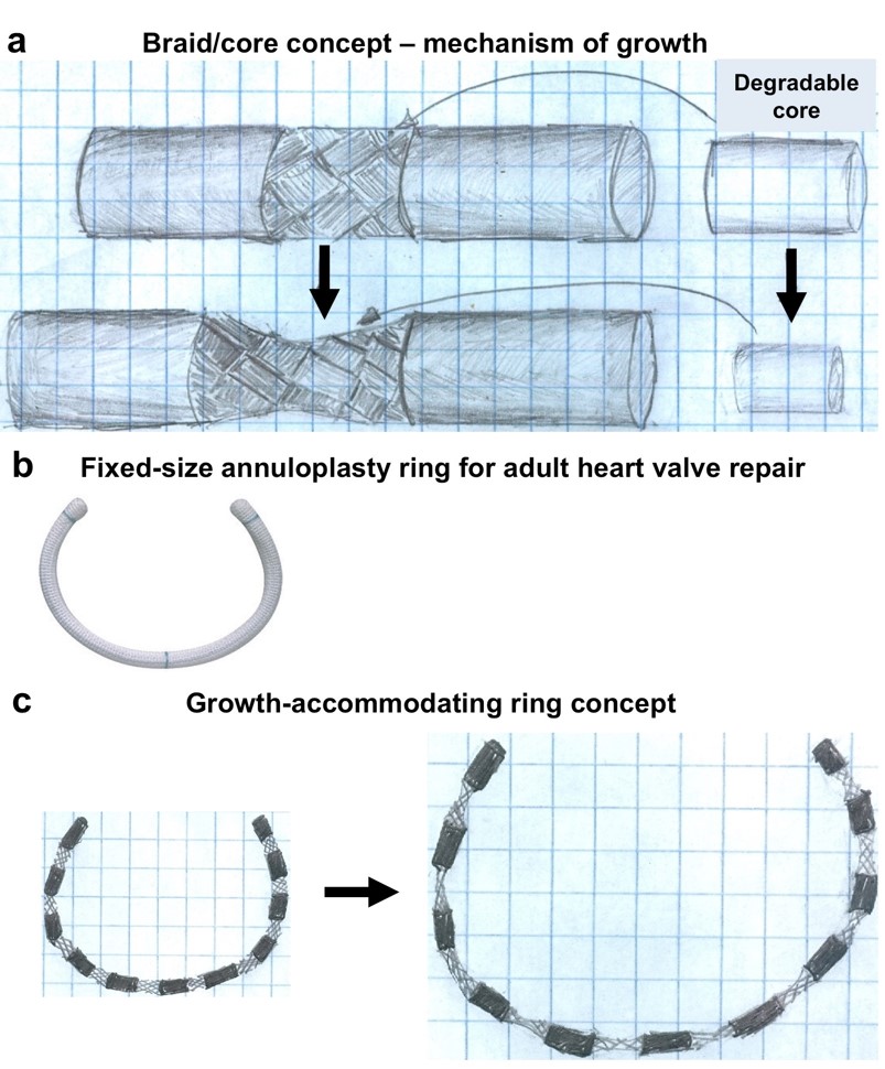 Figure 2. a, Early sketch demonstrating concept of autonomous device growth utilizing a braided sleeve and degradable core. b, Commercially-available, fixed-sized annuloplasty ring used in adults. c, Application of our design concept to create a growth-accommodating annuloplasty ring.