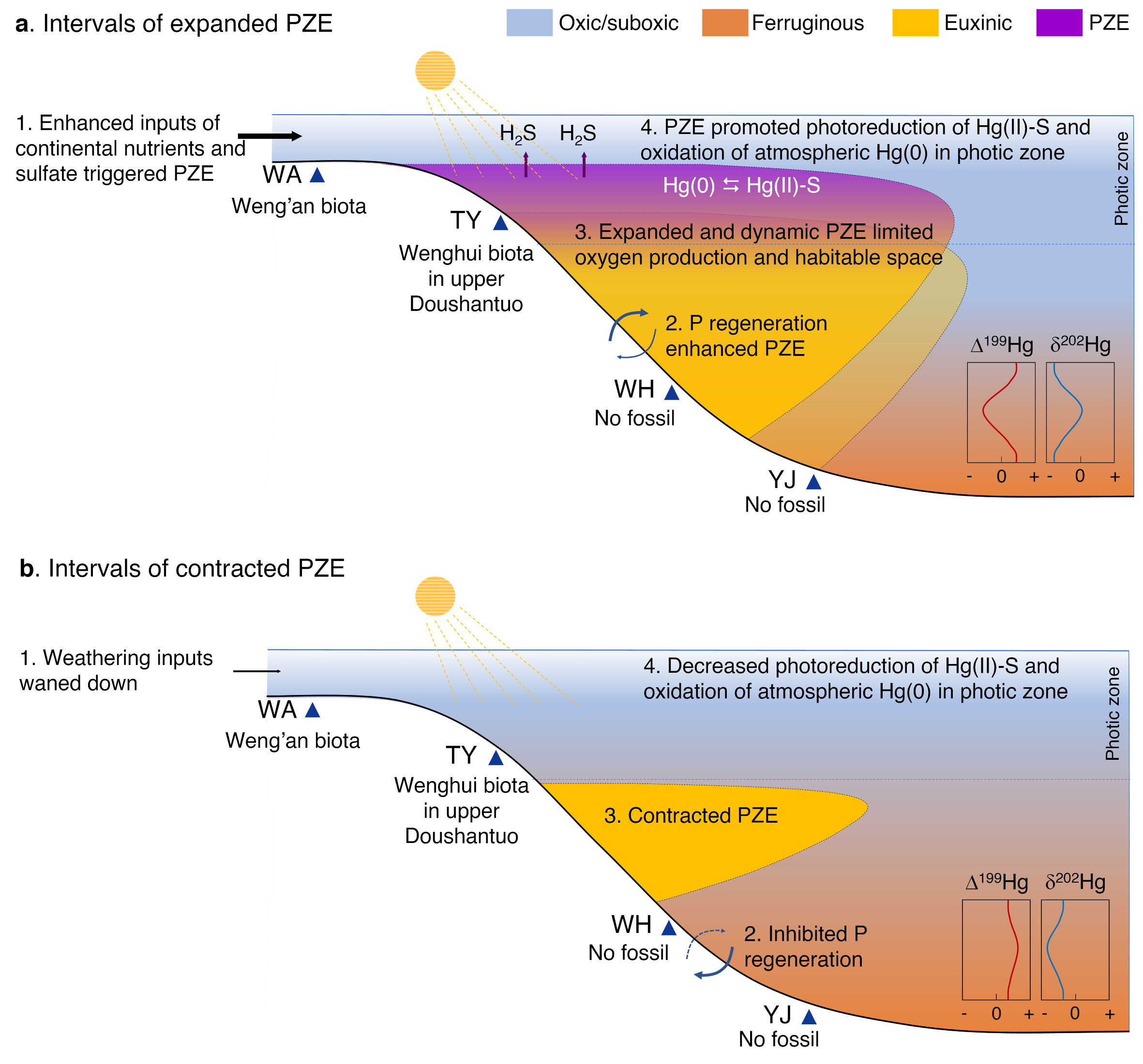 Recurrent and widespread PZE may have exerted a negative impact on the marine O2 level and early animals by promoting anoxygenic photosynthesis and limiting the habitable space of early macroscopic eukaryotic life via H2S poisoning. Extant anoxygenic phototrophs are able to grow photosynthetically with H2S as well as Fe(II) and H2. The competition for light and nutrients between anoxygenic and oxygenic photosynthetic organisms has been proposed as a key mechanism responsible for the delayed oxygenation of Earth's atmosphere and sustaining the relatively low level of oxygen throughout the mid-Proterozoic. Thus PZE may have created favorable marine environment for the growth of anoxygenic photoautotrophs, which in turn could suppress the O2 production by oxygenic photoautotrophs. Recurrent PZE also caused repeated H2S poisoning in the photic zone, limiting the ecological expansion of macroscopic multicellular eukaryotes. Among the four study sections, in relatively shallow-water shelf and upper slope facies where PZE was absent or sporadic, eukaryotes were able to colonize the benthic realm, as represented by the Weng'an and Wenghui biota. In contrast, in the lower slope and basinal facies where PZE was more persisted, no benthic fossils have been reported. A limitation of our study is that we did not directly measure samples from fossiliferous intervals, which warrant further investigations.