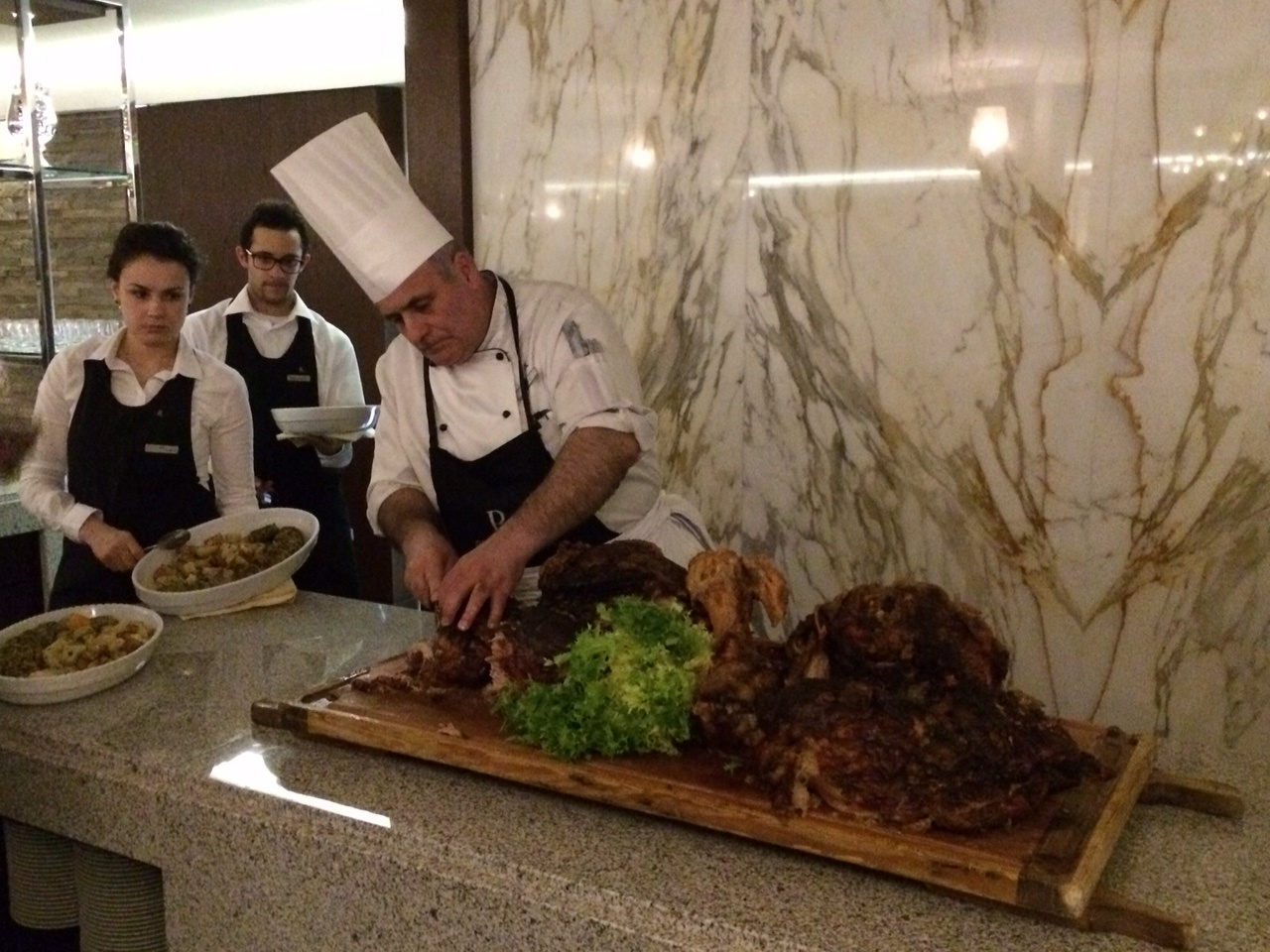 - Food was very good, with a leg of veal roasted for us on the last night's dinner, complete with chef dissection.