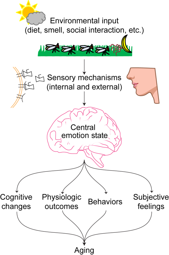 Beyond the general appeal of the (admittedly unproven) concept of emotions driving health and aging, this framework provides an avenue for hypothesis generation and testing, both within Drosophila as well as when translating this work to other species. For example, a key property of emotions is that they are fluid and temporary in nature, and in another recent article we determined that the consequences of pheromone exposure on mortality were indeed reversible if the exposure is removed. More broadly, it has led us to consider other potential stressors and how they may impact aging physiology and behavior in flies. In the future, we hope that these kinds of studies will encourage researchers to investigate whether emotions in all forms may impact healthy aging as well as the conserved nature of the building blocks of emotions.