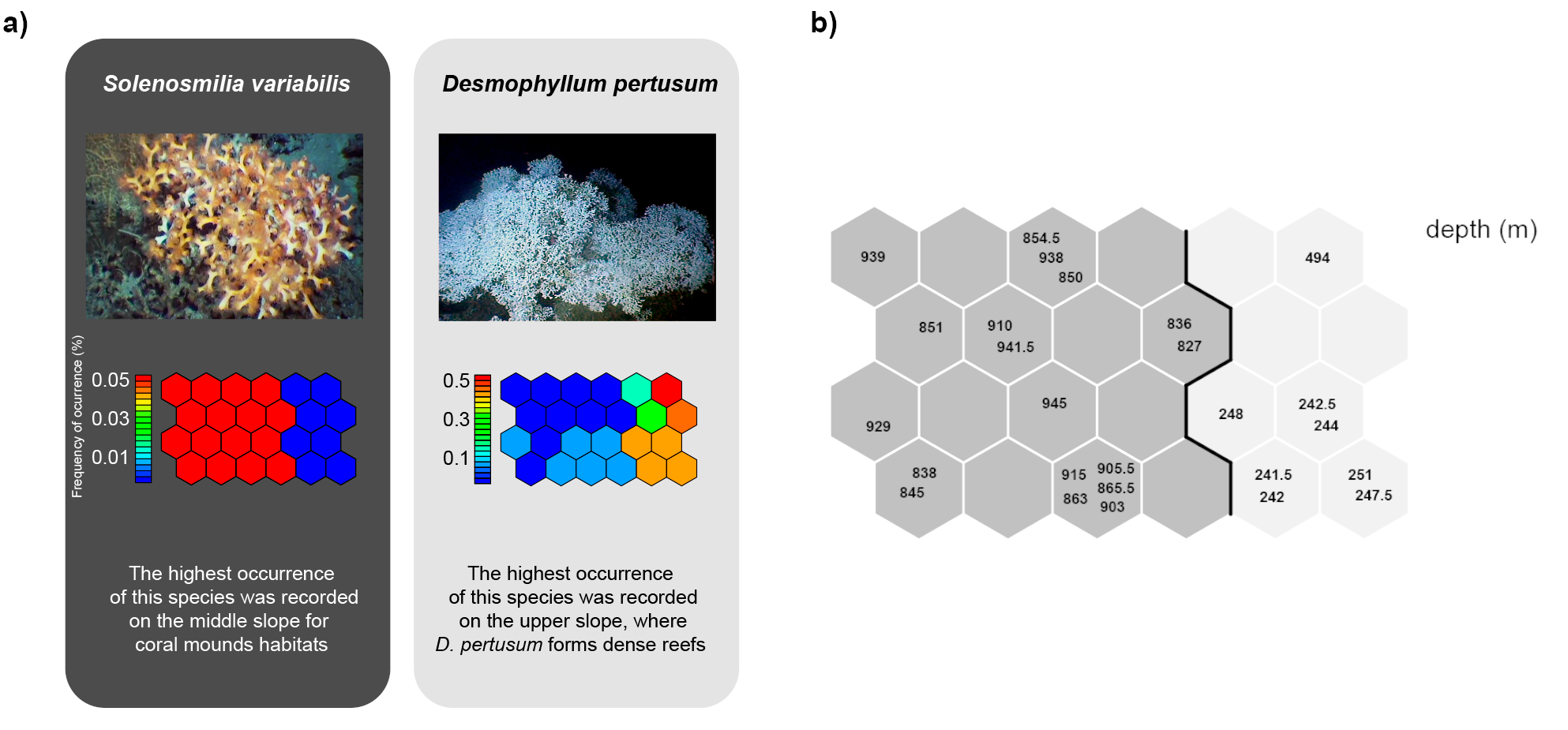Figure 2. a) Distribution patterns of the best match units taxa in the trained SOM (self-organizing map) based on the frequency of occurrence of deep-sea coral, and b) Distribution of sampling depths on the SOM. Each map corresponds to one taxon; these can be superimposed onto the map representing the cluster distribution of depths to show at which depths they are more frequently observed.