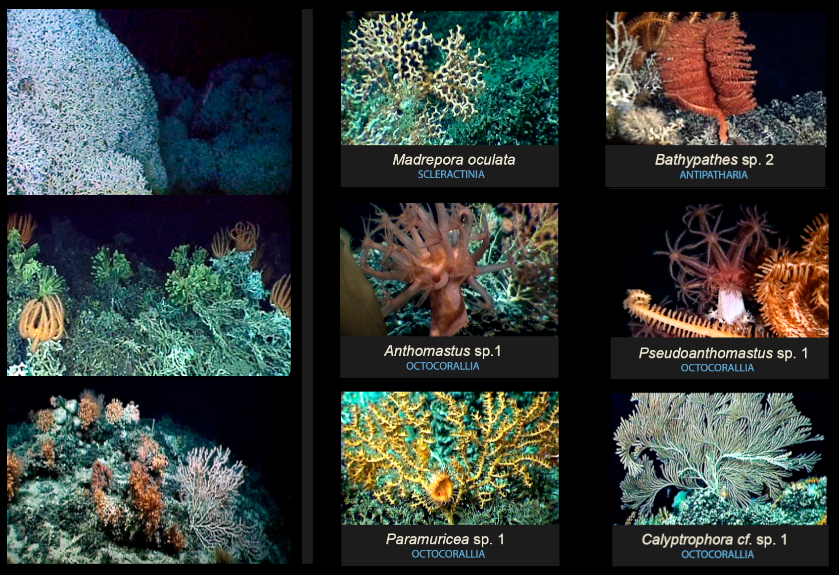 Although some species exhibited broad distributions, most of them inhabited the middle slope. Coral assemblage structure and richness varied with depth, reflecting the presence of different water masses stacked atop each other, each carrying distinct physical-chemical properties and varying food loads. For example, Solenosmilia variabilis was the most abundant stony coral and never formed large reefs, preferring the AAIW. The well-known hard coral Desmophylum pertusum predominantly inhabited shallower areas bathed by the SACW, where it formed larger reef structures in some places (Figure 2).