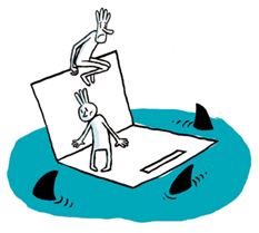 [Image description: cartoon of two people on a laptop surrounded by shark-infested waters]