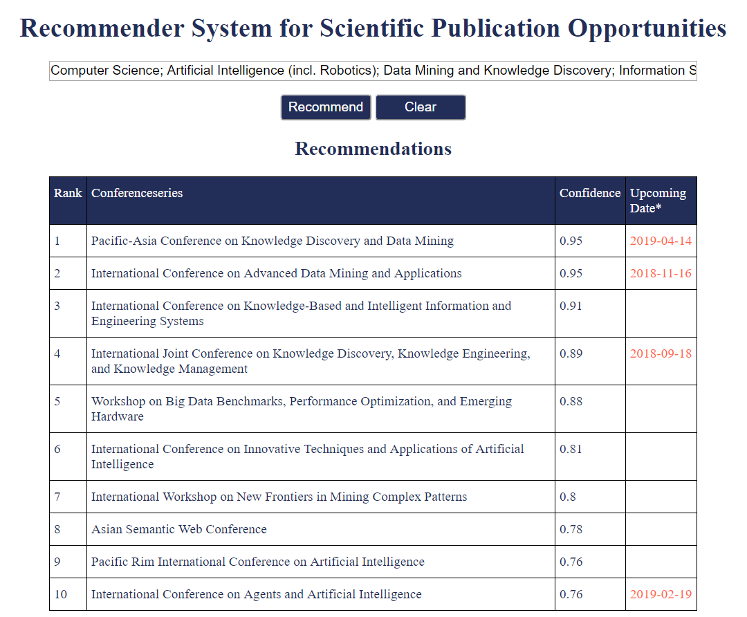 The SN SciGraph information on past conferences and publications served as the main dataset used for training the recommender system. Additionally, this past-oriented dataset has been enriched with data on future conferences, their submission dates, and other related information mined from WikiCFP, a Web page which publishes calls for papers, in order to provide information on upcoming conferences.
