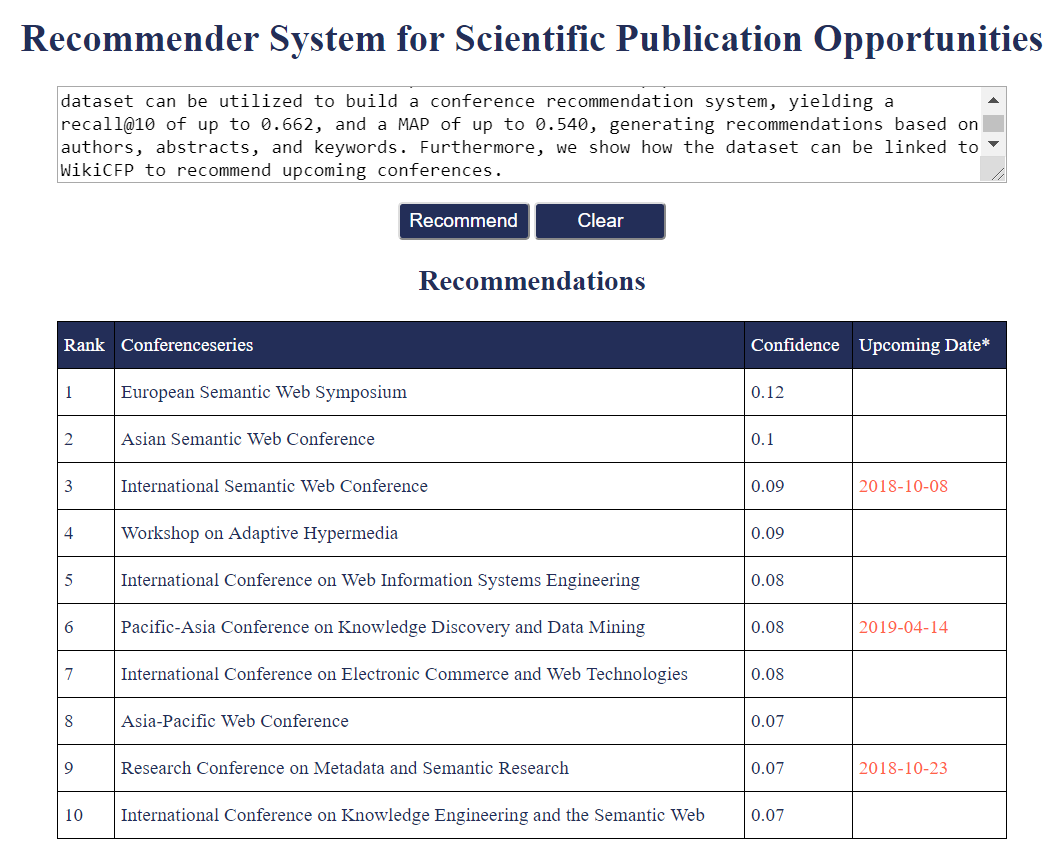 These questions were tackled by three students of the University of Mannheim (Andreea Iana, Steffen Jung, Philipp Naeser), who created a recommendation system that suggests publication opportunities. The service aims to recommend possible conferences where a new paper can be submitted to, and is based on the Springer Nature Scigraph data.