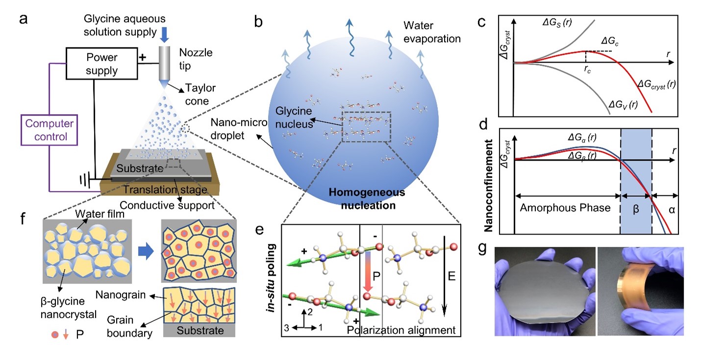 We presented an active self-assembly strategy for the first time to prepare high-performance piezoelectric biomaterial films through synergistic nanoconfinement and in-situ poling. The nanoconfinement-induced homogeneous nucleation overcomes the interfacial dependency and allows the electric field applied in-situ to align crystal grains across the entire film. The β-glycine nanocrystalline films are fabricated based on a bio-organic film printer using the electrohydrodynamic spray method. We then proposed the potential nucleation and crystallization process as follows. The β-glycine nanocrystals are formed through homogeneous nucleation owing to the small size and substrate-free property of in-flight nano-micro droplets. As homogeneous nucleation is not influenced by solid-liquid interfaces, it is possible to manipulate the crystallization process by applying external electric fields, which also serve as the poling process. The in-situ electric field in the crystal growth process induces the domain alignment of β-glycine nanocrystals, suggesting the net polarization direction [020] is parallel to the electric field.