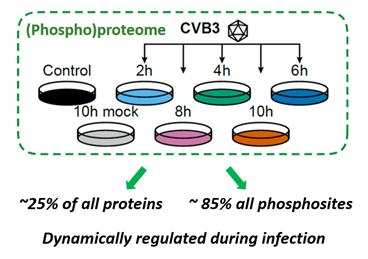 To study the full extent to which viruses make use of post-translational regulatory networks, we performed a system-wide, unbiased proteomics and phospho-proteomics screen on cells infected with the picornavirus CVB3. CVB3 belongs to a group of enteroviruses that include many human pathogens as well as newly emerging global health threats such as EV-A71 and EV-D68. At multiple time points after CVB3 infection, we traced the up- or downregulation of protein levels as well as changes in their phosphorylation status by mass spectrometry. An impressive change in protein levels was observed, affecting over 25% of the detected proteins. Yet this change was exceeded by an even more astounding impact of the infection on the phosphoproteome, with over 85% of identified phosphosites significantly altered.