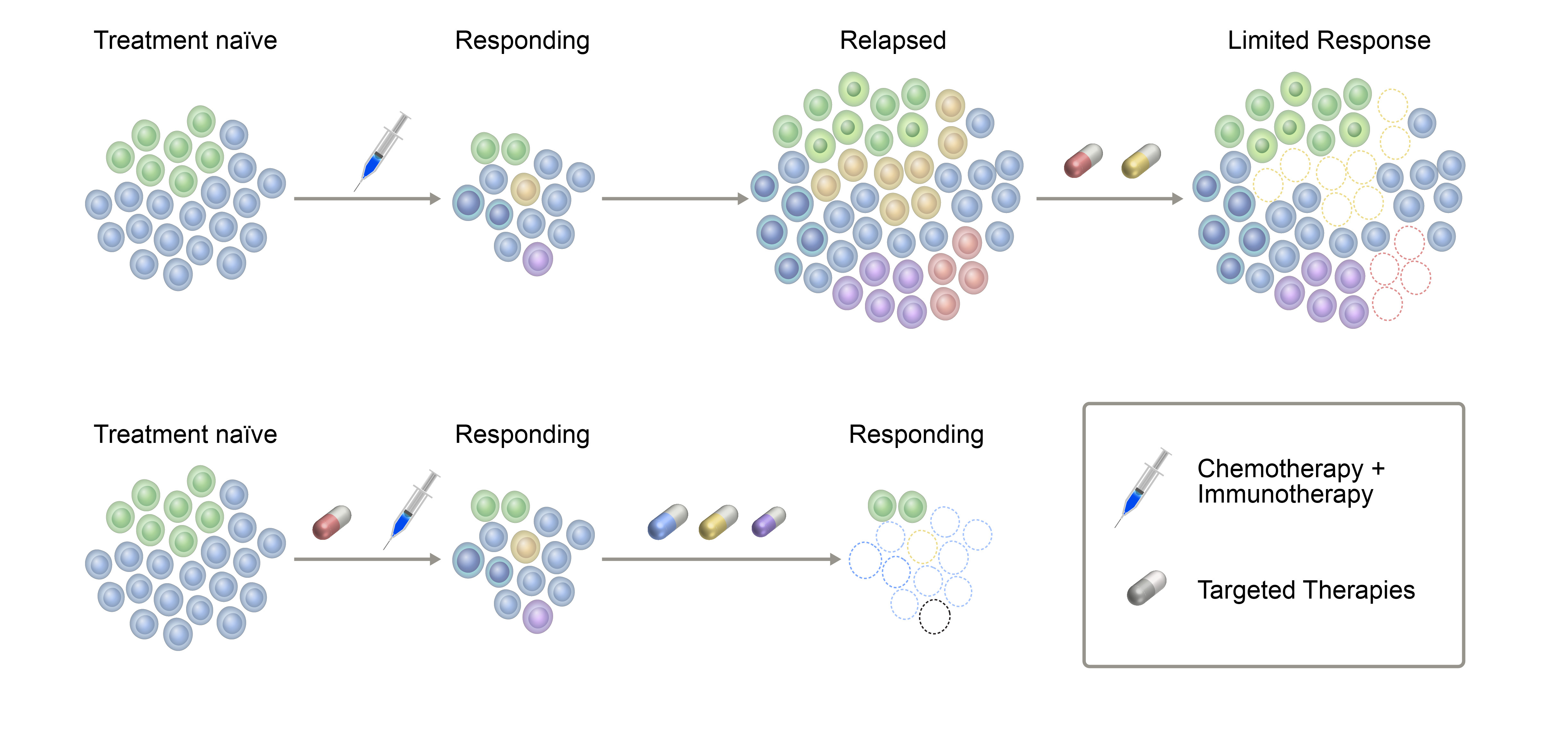 Thus, initially there is little cell-to-cell transcriptional variety within a single SCLC tumor and, accordingly, the majority of these cells generally respond well to frontline chemotherapy. However, the cells that persist are capable of evolving into transcriptionally diverse populations that are highly dissimilar from one another, allowing for only modest responses to single-agent treatments (Figure 3, top). We propose that rational approaches to SCLC should focus on early use of combinatorial treatments, including conventional chemotherapies, targeted therapies, and immune-based therapies, as a strategy to effectively target multiple populations of cells concurrently (Figure 3, bottom).