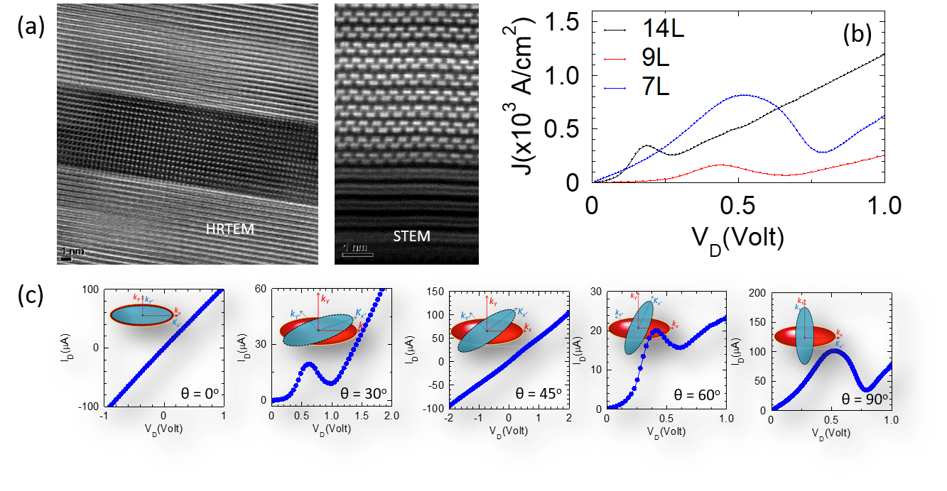 Interestingly, resonant tunnel diodes based on twisted anisotropic black phosphorus homojunctions exhibit higher tunneling conductance (~1000 A/cm2) as compared to other resonant tunnel diodes based on vdW heterojunctions with physical barriers [8-9]. Moreover, twist controlled tunnel devices with high current density could further be employed to realize high speed electronic devices such as THz oscillators and ultrafast switches etc. Parasitic capacitance at higher frequencies (one of the limitations to achieve desired THz regime) will be greatly reduced due to absence of resistive physical barriers. Hence, such homojunctions could offer great potential to attain much-needed THz operation which is quite useful due to their superior resolution when compared to other safe wavelengths.