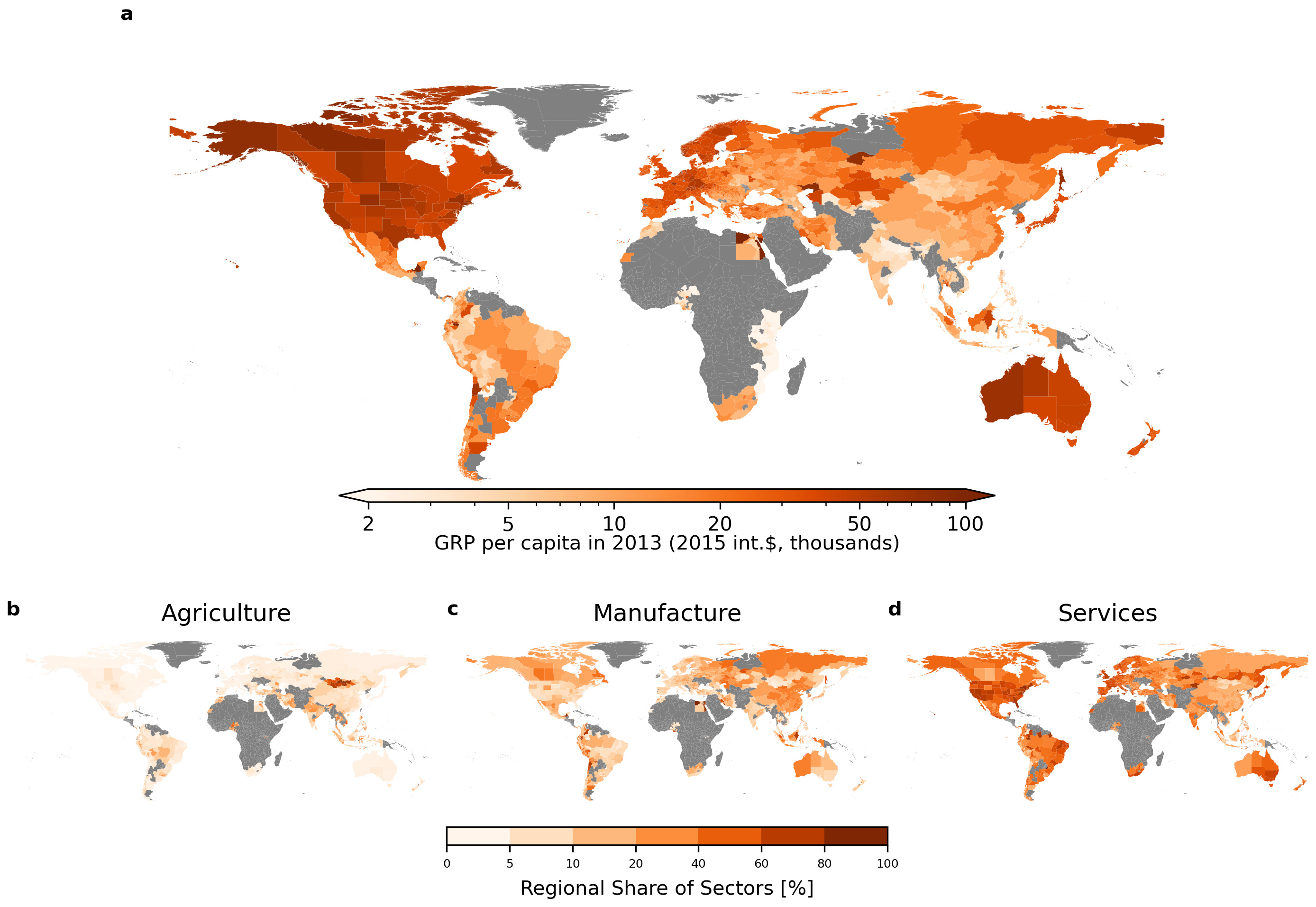 As our main contribution, we provide DOSE, a global, sub-national database of reported economic output from 1960 onwards for more than 1,600 regions across the globe. For most regions, we also provide a sectoral breakdown of output, divided into three categories: agriculture, manufacturing (industry), and services. The key strength of our database beyond its spatial and temporal coverage is the fact it only consists of “official” (reported) values that we collected from various national statistical offices and supranational bodies like EuroStat or OECD. There are naturally some gaps in the data, but we have not estimated anything ourselves and refrained from using interpolation to fill them, unlike other similar data products. We demonstrate a simple use of our data in the figure shown above. In the upper panel, one can clearly identify within and between-country differences in output for a specific year, while the lower 3 panels tell us more about the sectoral breakdown of these regional economies.