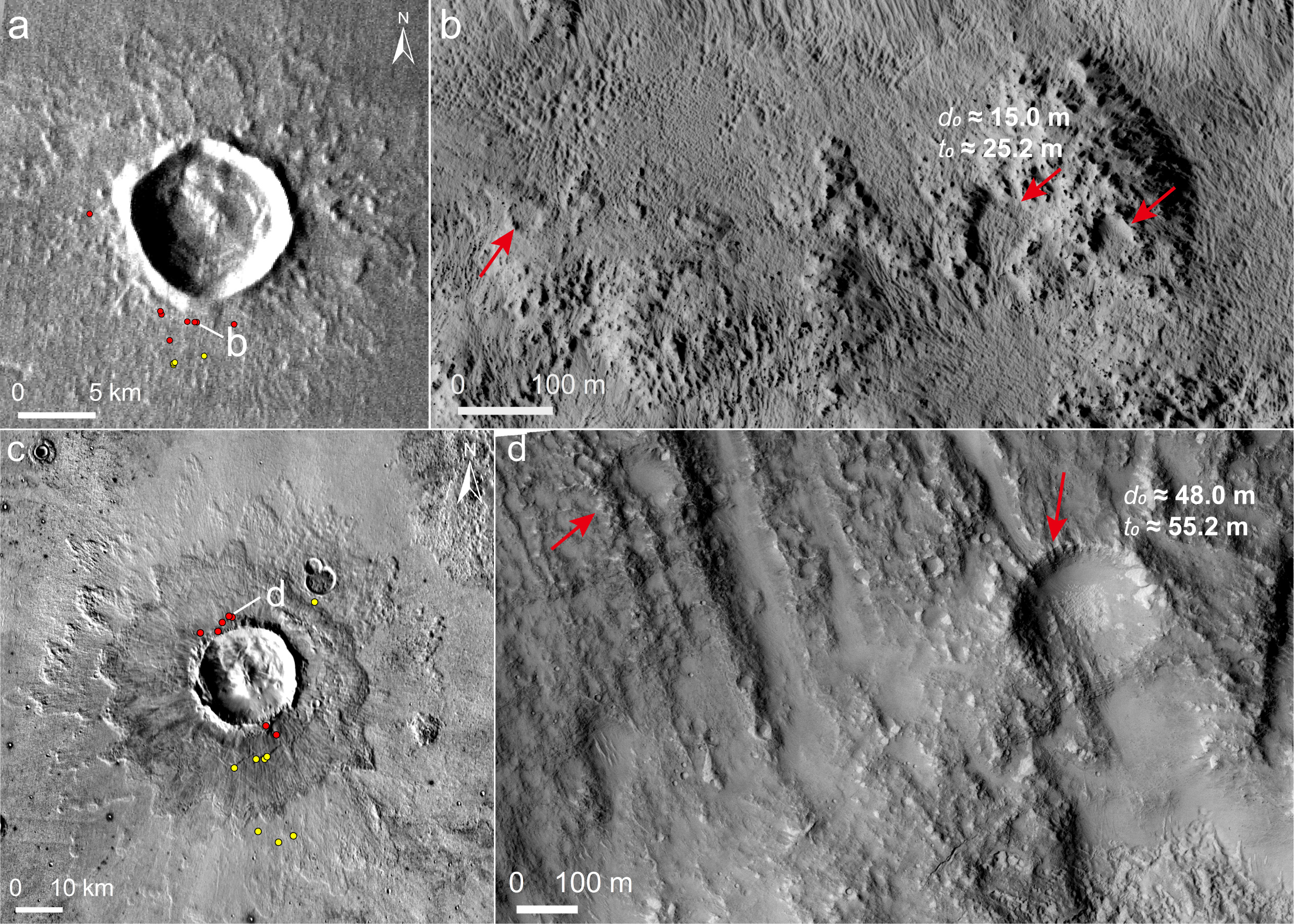 High-resolution geological investigations around the selected craters reveal that self-secondaries are generally rare in SLE or MLE deposits and are mostly confined to crater rims (Fig. 1). Crater densities across different azimuths and radial distances in SLE or MLE deposits are comparable, suggesting that self-secondaries are a negligible population in SLE or MLE deposits. In contrast, a small number of self-secondaries are observed in Type 1 DLE deposits, where crater densities show a recognizable nonuniform distribution. Among martian craters with diameters of larger than 3 km, only six have Type 1 DLE deposits and formed in the Late Amazonian. Given that the proportion of self-secondaries in visible crater populations should decrease with time, our findings suggest that self-secondaries are not a major concern in age estimation for most martian craters, except for the few young craters with Type 1 DLE deposits.