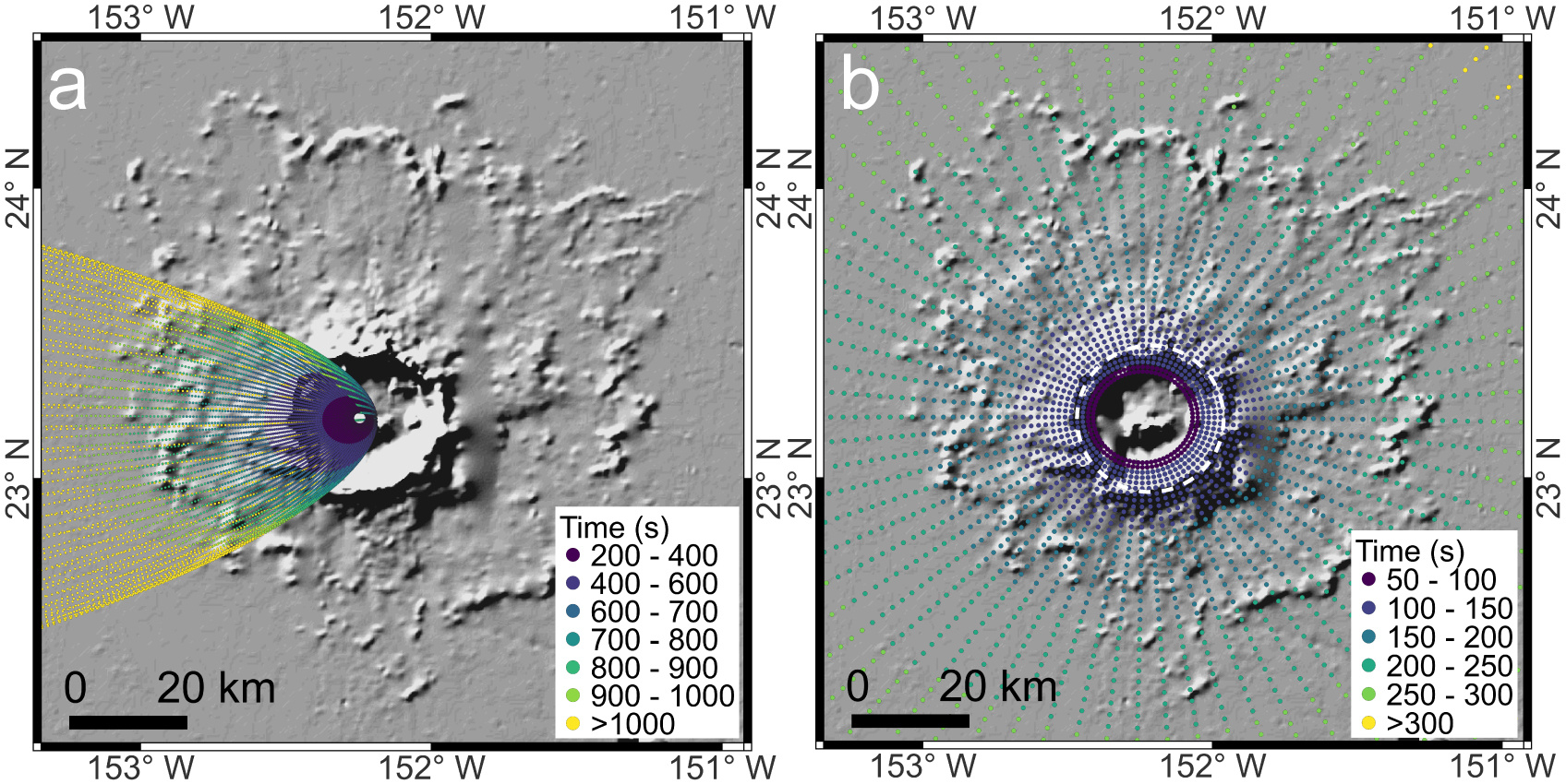 We also simulated fragment ejection at angles that are slightly larger than those of normal excavation flows, resulting in a widespread distribution of self-secondaries on continuous ejecta deposits (Fig. 2b). Yet again, our observations showed that self-secondaries were absent in SLE and MLE deposits and preferentially occurred on crater rims. This suggests that most self-secondaries did form during the emplacement of layered ejecta deposits and were subsequently erased by the advancing ejecta layers. This interpretation further implies that the duration of emplacement of SLE and MLE deposits should be comparable to or slightly longer than flight times of fragments forming self-secondaries.