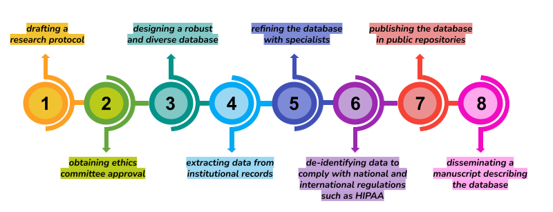For these reasons, we proposed to transparently collect and publish databases of medical images accompanied by demographic information that reflects the peculiarities of the Argentine population. We developed an 8-step standardized process to achieve this, visualized in Figure 1.