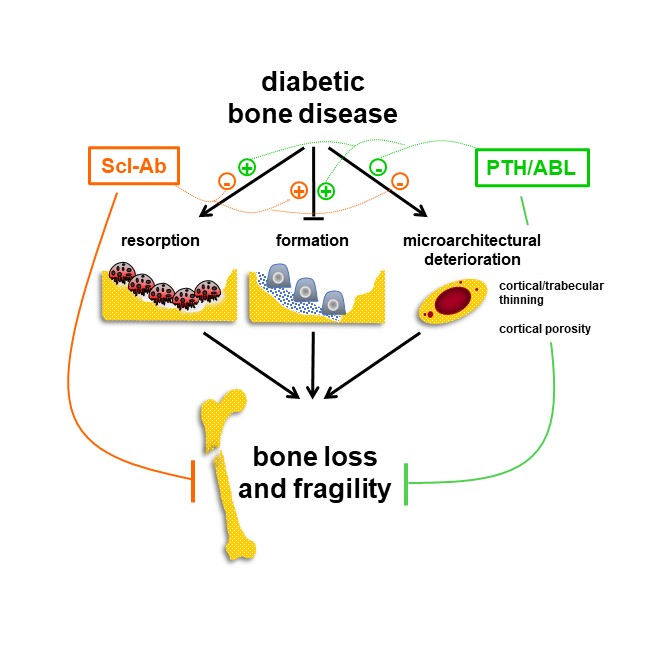 A common feature of DM-associated bone disease is reduced osteoblast number and function and low bone formation.6 However, the standard of care are anti-resorptive agents, bisphosphonates or denosumab, which stop bone loss but do not increase bone formation, thus failing to repair the deteriorated bone architecture.