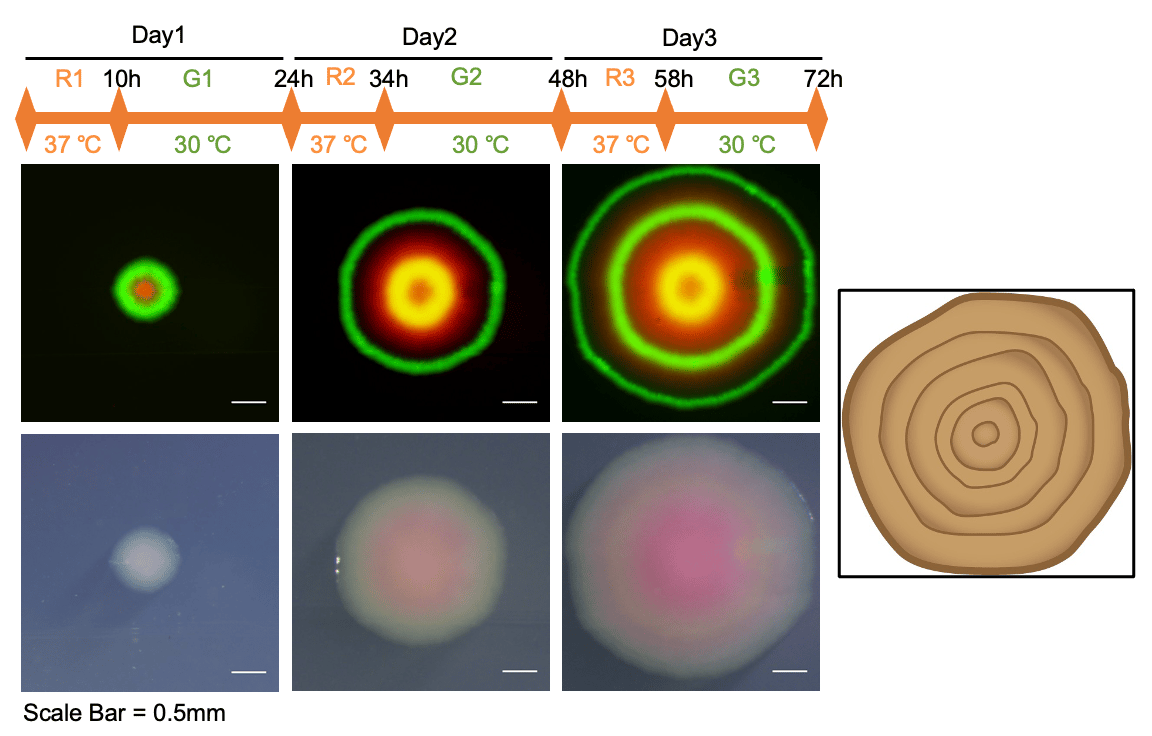 The first idea was inspired by the growth rings of trees triggered by seasonal changes of temperature and humidity. We mimicked this patterning process to build bacterial colony rings on plate. Colonies were cultured under periodically changing temperature for three days with ordered red- and green-rings formation.
