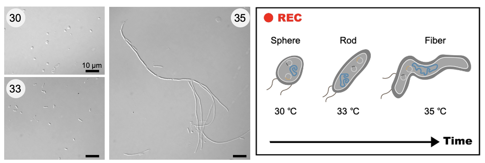 Based on the success of colony patterning on a millimeter scale, we then used this thermo-switch to control cell morphology in single cell level. The fluorescent reporter genes were replaced by two morphology-associated genes, mreB and ftsZ, encoding proteins to control sphere and fiber cell shapes. Recombinant cells grown at 30, 33, and 35℃ in the chamber of microfluidic device showed spherical-, rod- and fiber-shapes, respectively. Furthermore, videos captured in chip chambers recorded the dynamic changes of bacterial cells from spherical- to rod- and/or fiber-shapes by altering culture temperature.
