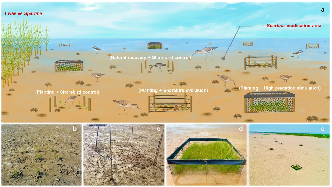 In the Yellow Sea where our study was focused, invasion of the exotic smooth cordgrass Spartina alterniflora has transformed marshes formerly dominated by native plants including Scirpus mariqueter, threatening critical stopover habitat for millions of shorebirds that migrate along the East Asian-Australasian Flyway. In a coastal salt marsh in the Yangtze estuary, even though exotic cordgrass was eradicated in 2015, native vegetation has not yet recovered.
