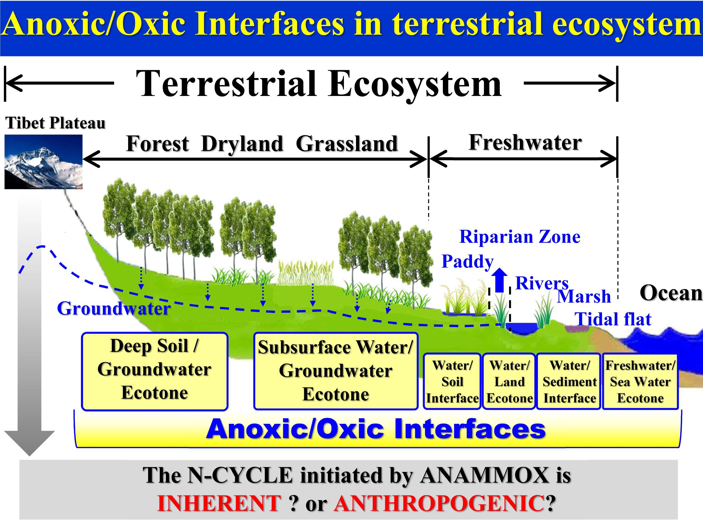 Since 2008, we have been studying anammox. As revealed by the investigations in the last decade, anammox is ubiquitous in freshwater ecosystem, including paddy fields, lakes, river, marshes, etc. Furthermore, it is evidenced that riparian interfaces sediments are the anammox hotspots with effective reduction of nitrous oxide (N2O) emission. However, less than 10% of the land surface area is covered by freshwater and wetlands. Apparently, the anammox in terrestrial ecosystems cannot be such influential as in marine. Considering this, we raised the hypothesis that larger-scale distributions of anammox exist in global aquifer system.