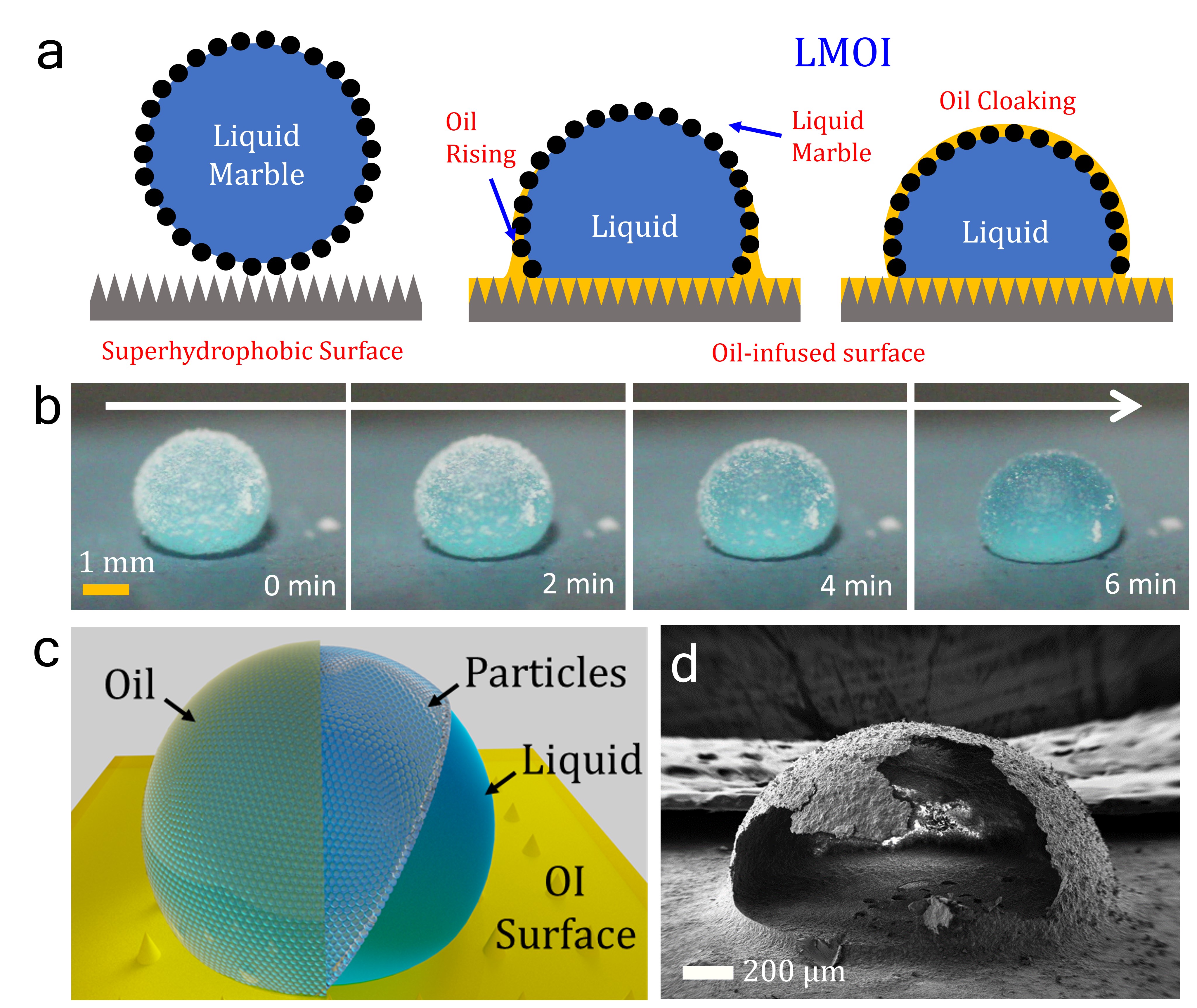 Capillary force-assisted cloaking holds the potential to revolutionize the way we encapsulate droplets. This technique combines the hydrophobic nano-micron-sized particles and oil-infused surfaces to create uniform solid and liquid shell encapsulations (Figure 1a & b). The heart of this technique lies in the coating of droplets with hydrophobic nano-micron-sized particles, commonly referred to as liquid marbles. These particle-coated droplets then encounter oil-infused surfaces, setting the stage for capillary-driven cloaking due to porous network of particles. The presence of particles promotes and stabilizes the formation of an immiscible liquid film around the droplet, effectively encapsulating it (Figure 1c). Thus, this configuration is termed as Liquid marble on oil-infused surfaces (LMOI).