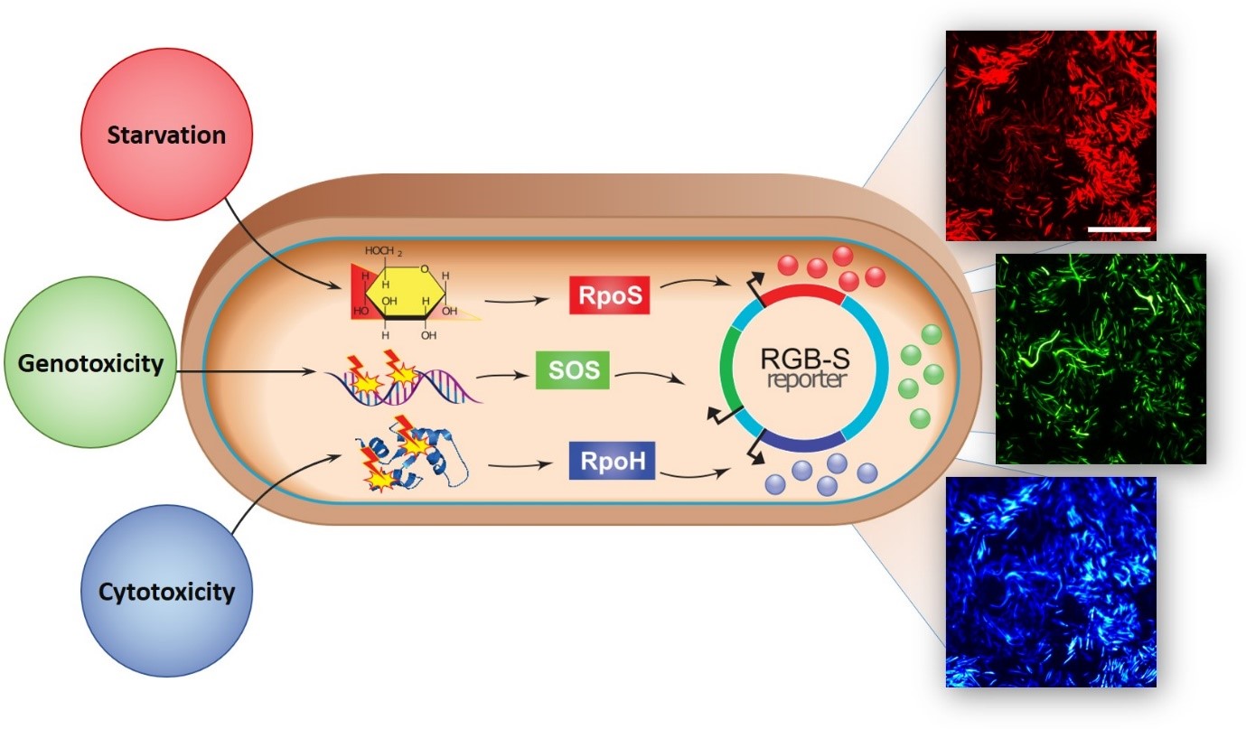 Fig. 1: RGB-S reporter system for monitoring bacterial starvation, genotoxicity and cytotoxicity.