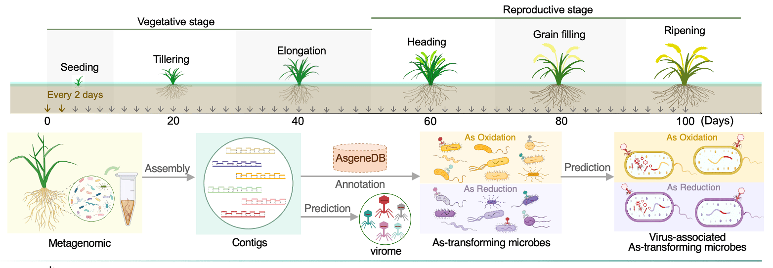 Arsenic (As), a toxic metalloid found globally in soils, poses significant environmental risks6. Rice (Oryza sativa L.) uptake of As is influenced by microbe-mediated As redox changes in the rhizosphere, where its roots promote a microbial community that aids in As oxidation through exudates and oxygen release7. This makes the rice rhizosphere an important model for studying As risk reduction8. However, the potential influence of viruses on As biotransformation remains unknown. Given that flooding increases connectivity between soil microaggregates and intensifies microbial interactions9, we hypothesized that rhizosphere conditions might amplify the role of viruses in influencing microbial As metabolism. This question drove our research, aiming to uncover the hidden connections between viruses, microbes, and As transformation in this complex and ever-changing environment.