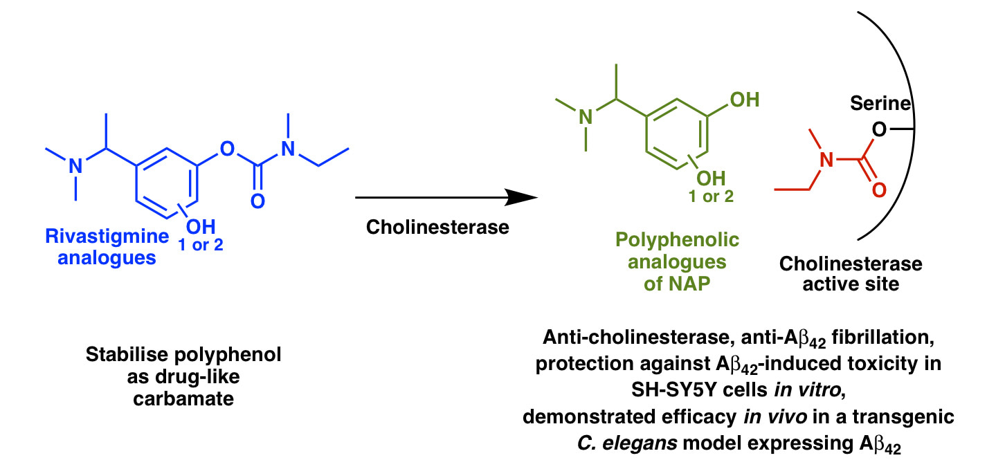The possible oxidation of polyphenols to potentially toxic quinones is often overlooked in bioactivity studies but deserves serious attention. The rivastigmine analogues described in our study are apparently protected from oxidation and therefore offer an opportunity for the brain delivery of an intact polyphenolic pharmacophore, as well as the investigation of its toxicity and of its effect on AD pathology in vivo. We are keen to follow-up on this aspect in model organisms with interested collaborators. We’ve also filed a provisional patent application to encourage further investment in these compounds, which have the potential to inhibit the progression of AD, among other properties yet to be published.