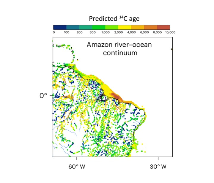 We have combined the riverine and marine surface sediment radiocarbon data with an extensive dataset for environmental variables and used machine learning to generate the first high-resolution global map of radiocarbon values in the river-ocean continuum.
