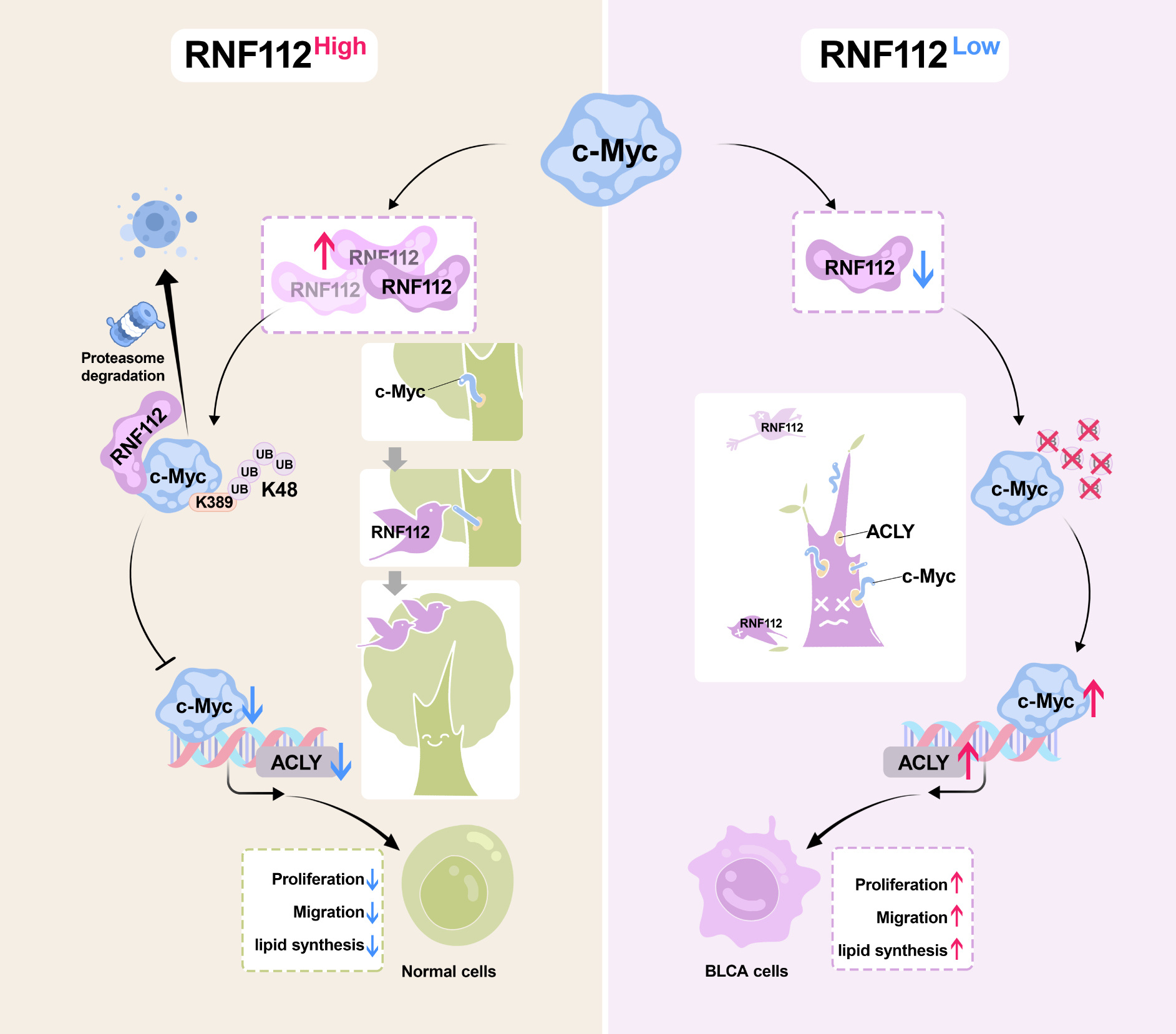 This study revealed that RNF112 expression was significantly reduced in BLCA. In vitro and in vivo studies indicated that RNF112 suppresses BLCA cell proliferation, migration, and lipid synthesis. Mechanistically, RNF112 directly interacts with the MB II domain of MYC through its N-terminal zinc finger motif, and its catalytic site C97 facilitates K48-linked polyubiquitination of the K389 residue on the c-Myc protein, accelerating its degradation. Additionally, our research validated the interaction of c-Myc with the promoter of ATP citrate lyase (ACLY), a central enzyme of lipid metabolism, promoting its transcriptional activity. The restoration of c-Myc or ACLY expression attenuated the inhibitory effects of RNF112 on BLCA cell growth, migration, and lipid synthesis.