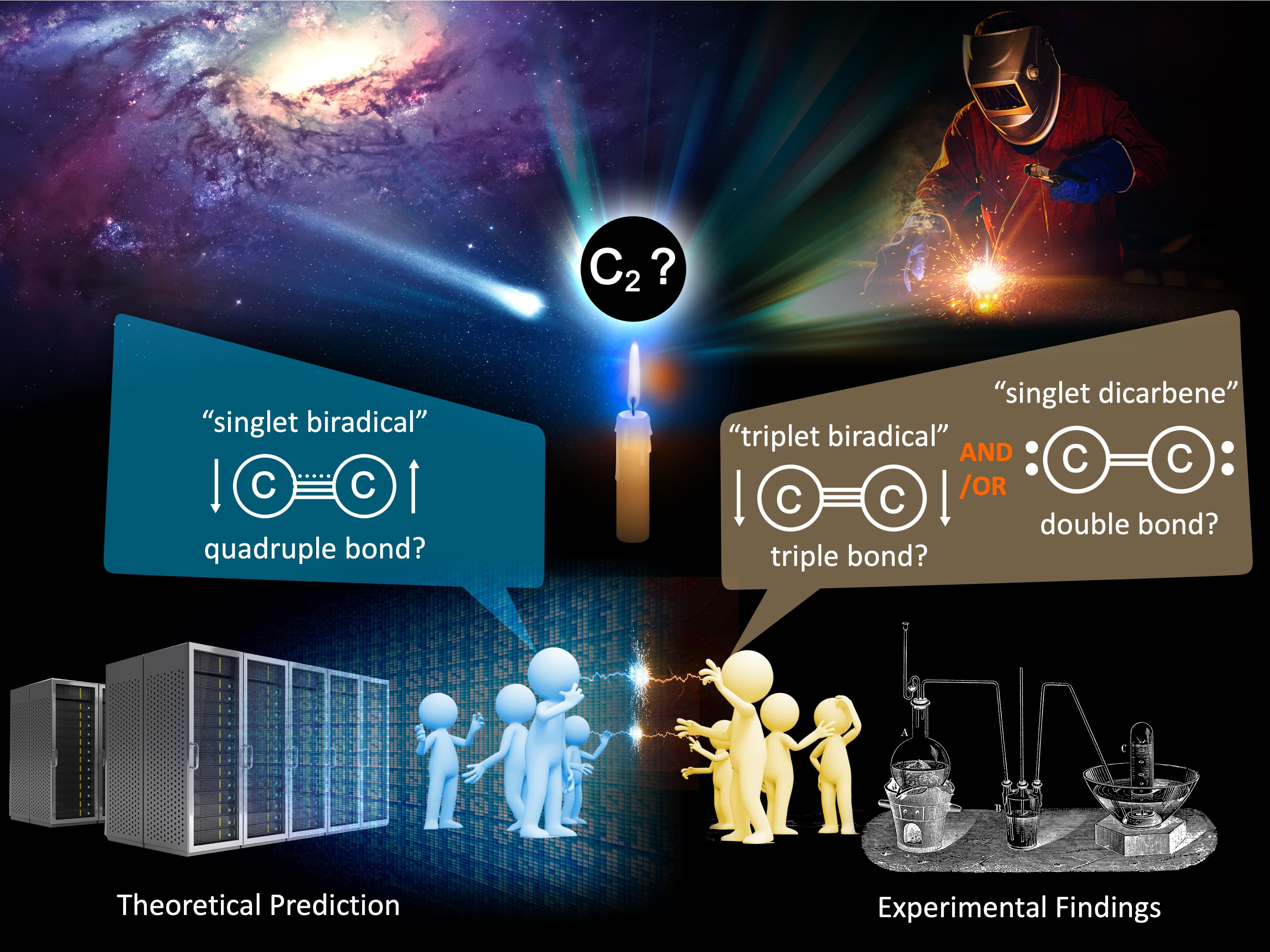 Fig 1 | Long-standing dispute between experimental and theoretical chemists concerning the nature of diatomic carbon (C2).