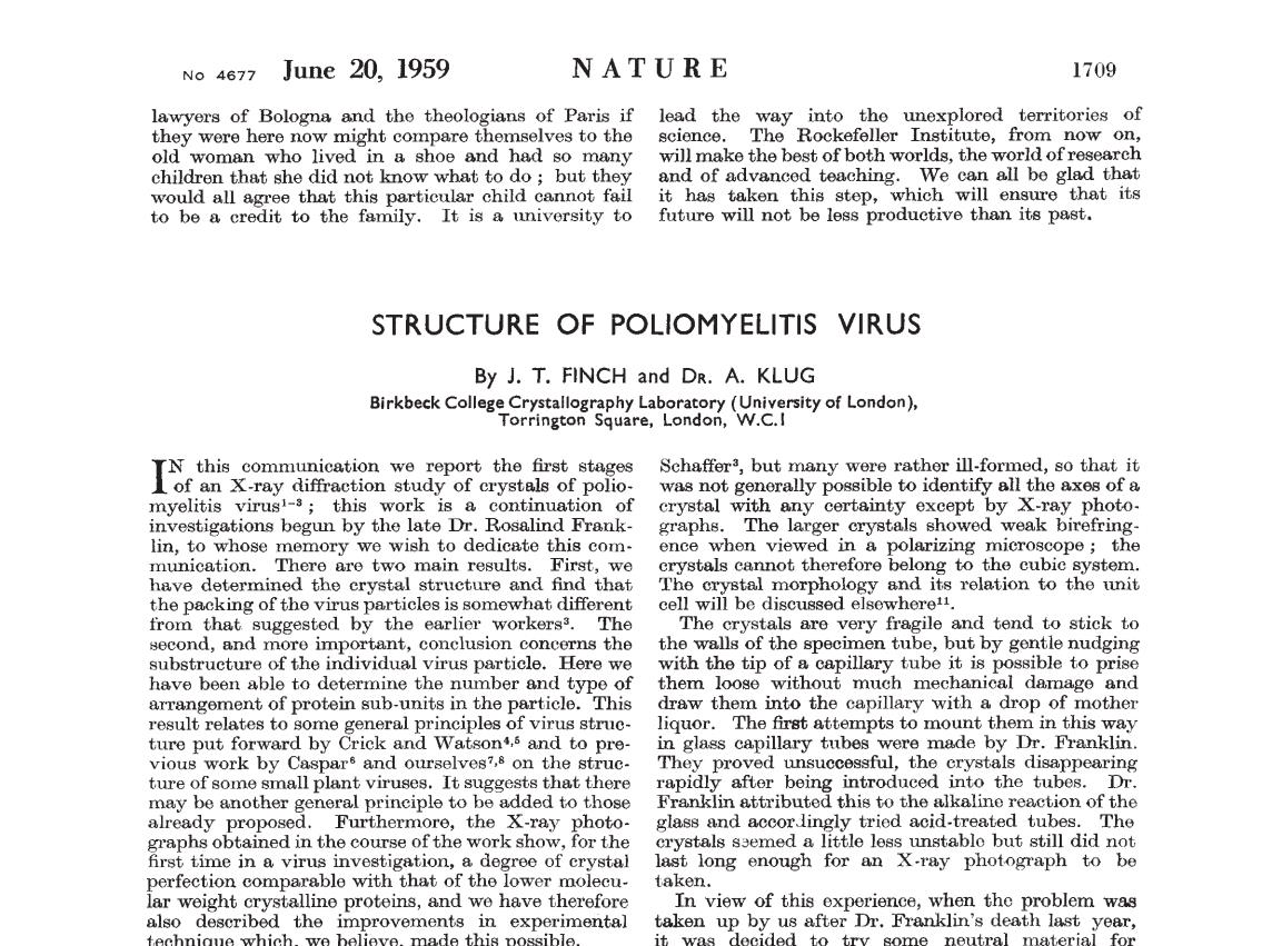The polio crystal structure was published after her death by her co-workers Finch and Klug - and dedicated to her memory. Had she lived, the Nobel Prize may yet again have been hers - it was awarded to Klug in 1982 for his work on protein-nucleic acid crystal structures, studies that he started with Franklin.