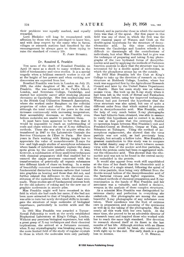 Her photographs are among the most beautiful x-ray photographs of any substance ever taken - said John Bernal in her obituary in Nature. Her enduring fame is mainly due to just two years working on DNA at Kings College London. A greater portion of her short career, after a PhD on the pores in graphite for the British Coal Utilisation Research Association, were on the structure of viruses.