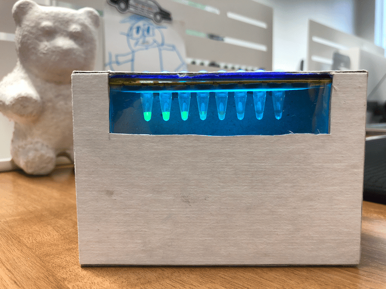 After proving out the concept with the TetR model transcription factor we immediately began to ask several questions centered around field-deployment and application. We turned to the Jim Collins Lab to help us brainstorm applications and develop a freeze-drying process and formulation that would allow us to break the cold-chain limitations of our technology. To further address whether this technology could be used in the field we looked in our backyard—Lake Michigan—and demonstrated functionality in surface freshwater. We also started to work on a low-cost handheld fluorescence illuminator to visualize the reactions, which started with me cutting up a cardboard box and micropipette tip racks from the lab, soldering a copper wireframe with a handful of resistors and LEDs, and gluing on a piece of stage light film to serve as an optical filter. With the help of Northwestern’s research shop, we were able to iterate on that early design and produce a beautiful 3D-printed device complete with a printed circuit board.