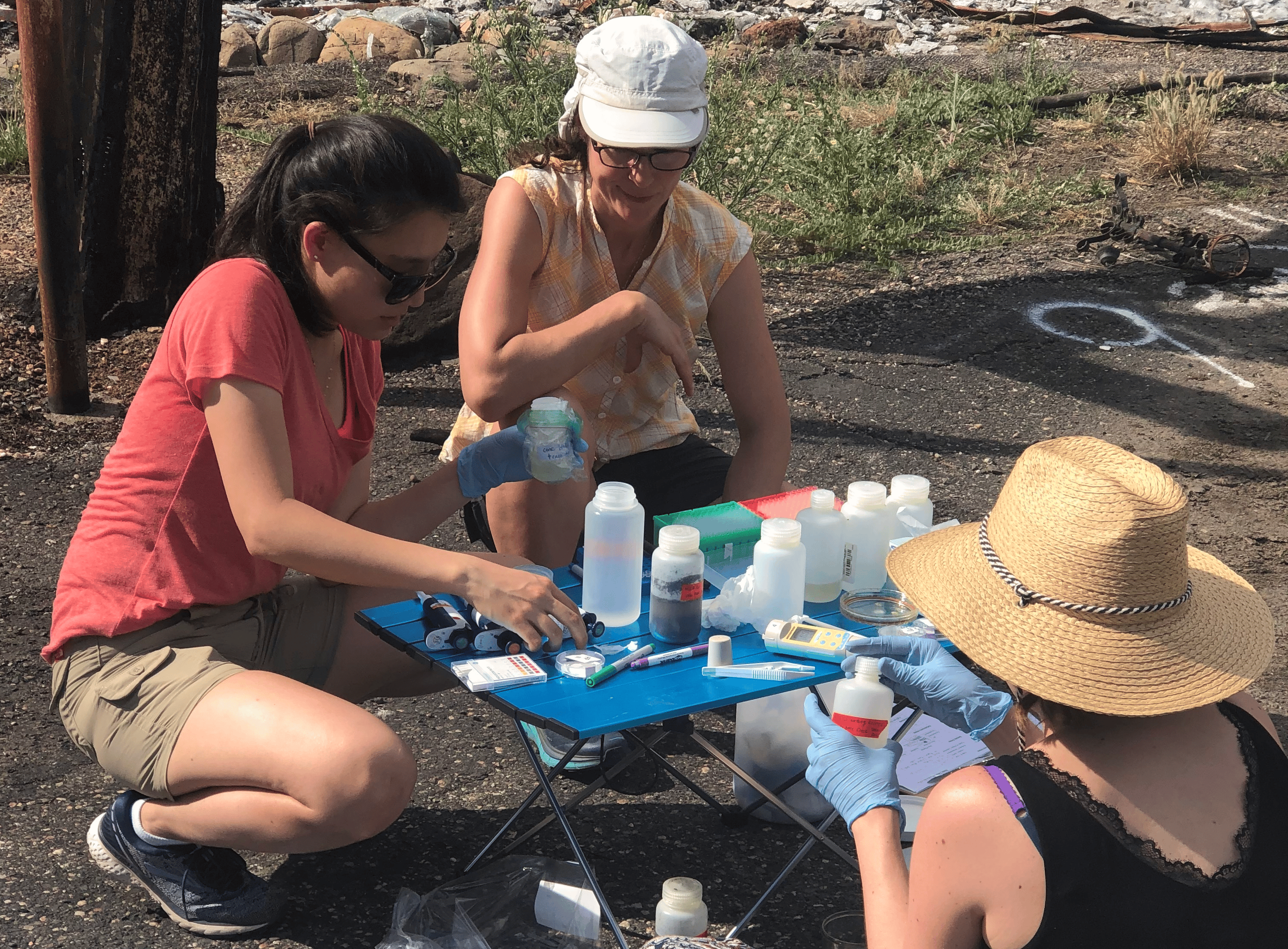 In June of 2019, our team took hundreds of lyophilized ROSALIND reactions configured to detect zinc, lead and copper to Paradise. It was surreal to see in person the aftermath of the Camp Fire – houses stripped down to ashes, supermarkets with their groceries exposed and rotten, and unflushed water faucets in the middle of deserted parks are only a few to mention. Although we tried to plan for every possible scenario, there were a few pain points during the fieldwork. For example, the small foldable camping table could not properly act as my “lab bench” to put down the tubes, pipettes and notes. Some of our lyophilized reactions also quickly became non-functional under the 100 oF temperature with extremely humid weather.