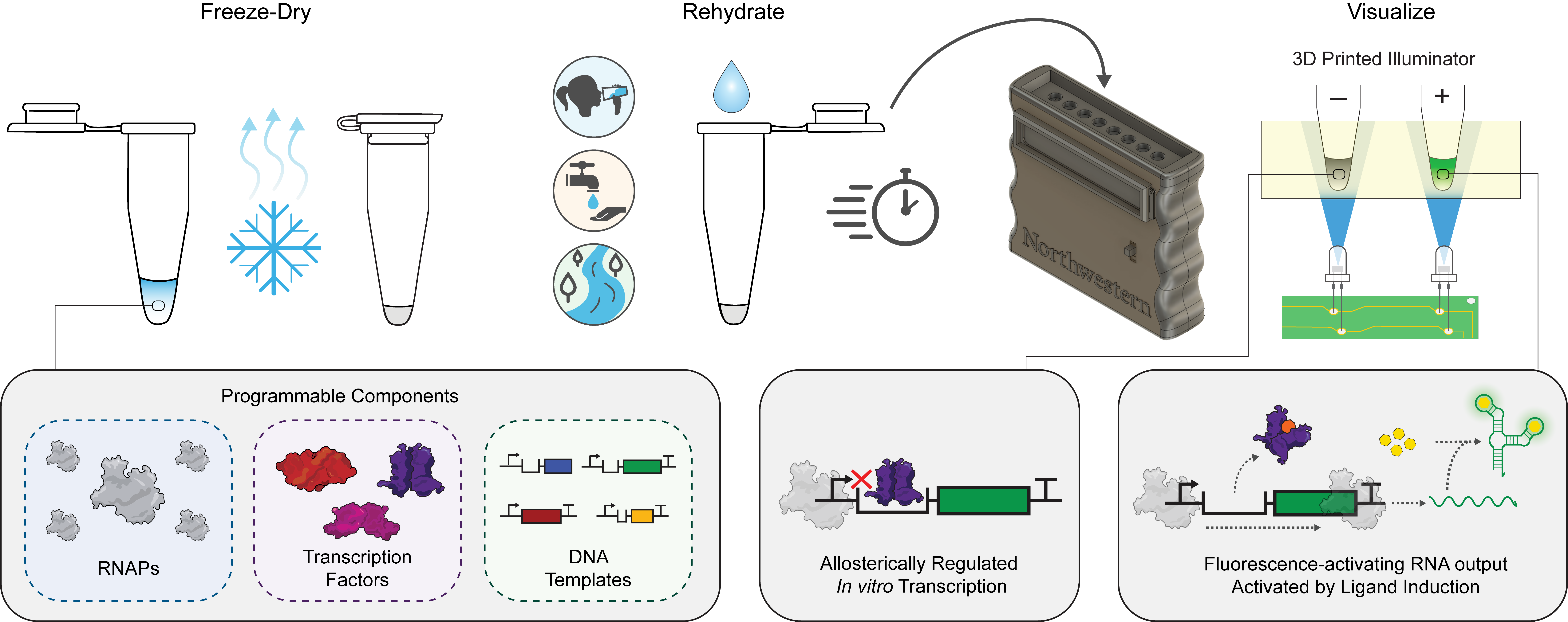 Water contaminants are detected with freeze-dried, regulated in vitro transcription reactions.