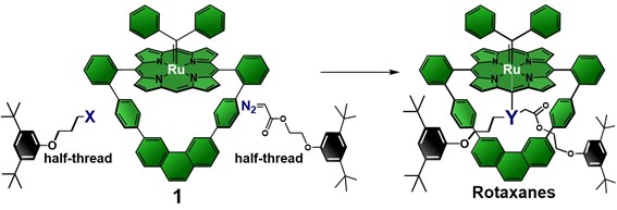 As part of our research program, we have developed porphyrin-based molecular hollow structures for the syntheses of mechanically-linked molecules. One example of those structures is the cyclic Ru(II)porphyrinate with a diphenylcarbene external axial ligand 1 (Figure 1). The main property of 1 is its ability to promote carbene insertion reactions from diazo derivatives inside the central cavity exclusively. Investigating 1 as the catalytically-active ring component for rotaxane assembly processes from the proper half-threads through carbene N-H or S-H insertions as the irreversible chemical step that connects the molecular pieces in the interlocked fashion, we found surprising results. Firstly, 1 is quantitatively incorporated into rotaxanes in the presence of a large excess (10x) of an equimolar mixture of half-threads, which are completely recovered as starting materials after reaction workup. No side reactions such as nucleophilic attack to the diphenylcarbene axial ligand by the amine or thiol half-threads, dimerization of the carbene intermediates due to the large excess of the diazo half-thread in the medium nor intercomponent reactions promoted by the rotaxane itself, all of which were expected under our experimental conditions, were observed in our experiments.