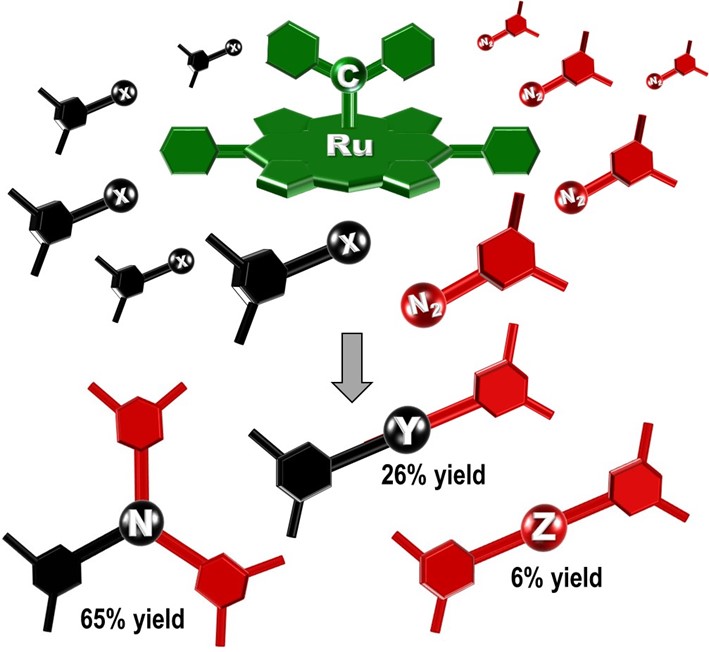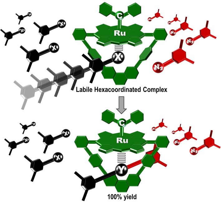 Spectroscopic investigation of the rotaxane assembly process revealed that the amine or thiol groups on the half-threads coordinate to the Ru(II) ion inside the cavity to yield the respective hexacoordinated complexes prior to the formation of the carbene intermediate. The thiol hexacoordinated complex is labile at room temperature, while the amine analog is at 60oC. Such lability of the hexacoordinated complexes informs that the amine and thiol half-threads enter and leave the Ru(II) ion coordination sphere quickly, thereby creating a local concentration of those chemical functionalities near the central cavity (Figure 2). As soon as the diazo half-thread has the chance to reach the Ru(II) center, the carbene intermediate is formed after extrusion of a N2 molecule. The higher local concentration of N-H e S-H groups near the Ru(II) ion speeds up the insertion reactions, which are now faster than the deleterious carbene dimerization side reaction.
