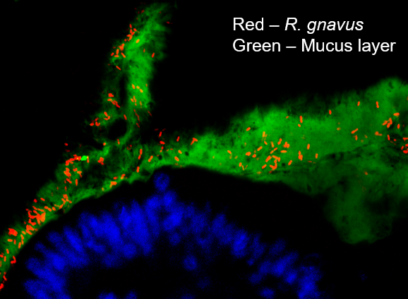 Having successfully developed a strategy to genetically manipulate R. gnavus (after nearly 10 years of failed attempts in the Lab!), we showed that the 2,7-anhydro-Neu5Ac gene cluster is a critical component to R. gnavus spatial adaptation in the gut. In an in vivo colonisation competition experiment in gnotobiotic mice, a R. gnavus mutant lacking the functional cluster was outcompeted by the wild-type strain and after a few days could no longer be detected. We believe that this adaptation strategy contributes to the prevalence of R. gnavus in the human gut microbiome 4.