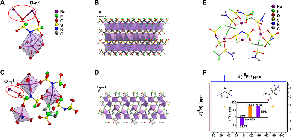 Figure 2. The solid crystal structure of NaFSI salt and NaFSI/PreTFSI (3:1 by mole) solid and liquid solvation of 0.5 M NaFSI in PreTFSI liquid electrolyte solution. (A) The asymmetry unit of NaFSI crystal shows the mono-capped octahedron, where six oxygen atoms facilitate the octahedral geometry with one nitrogen atom capped to the top. The O-η2- solvation mode of the FSI anion is highlighted in a red circle. (B) The close-packing structure of NaFSI crystal, in which the cationic layer with fluorine atoms is pushed aside. (C) The asymmetry unit of NaFSI/PreTFSI (3:1) solid structure with two octahedral solvated Na+ centers and one distorted trigonal bipyramidal site. All the FSI anion oxygen atoms adapt the O-η1- solvation mode as highlighted in the red circle. (D) The scattered packing layer in NaFSI/PreTFSI (3:1) crystal structure. (E–F) Solvation of SIPS5 electrolyte. (E) Proposed solvation cluster {Na3(FSI)4(PreTFSI)4} in SIPS5 electrolyte, where four NaFSI is solvated by four PreTFSI molecules to have the dispersed cluster rather than the infinite sheets in the isolated crystals showing in B and D. (F) 2D {7Li–1H} (orange-cyan, below) HOESY contour plot of SIPS5 electrolyte, the inset shows the chemical shifts of 19F-NMR of SIPS5 electrolyte and PreTFSI molecule.