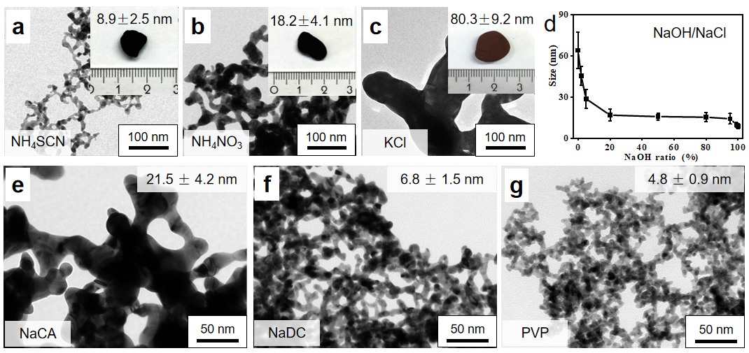 Our salt-mediated protocol tunes the ligament size of the gels via two approaches, i.e., by 1) applying specific common salts (Figures 2a-d) and 2) combining excessive NaBH4 and specific ligands (Figures 2e-g). The size modulation also adapts to other single- and multi-metallic systems, though not as prominently as the Au system.